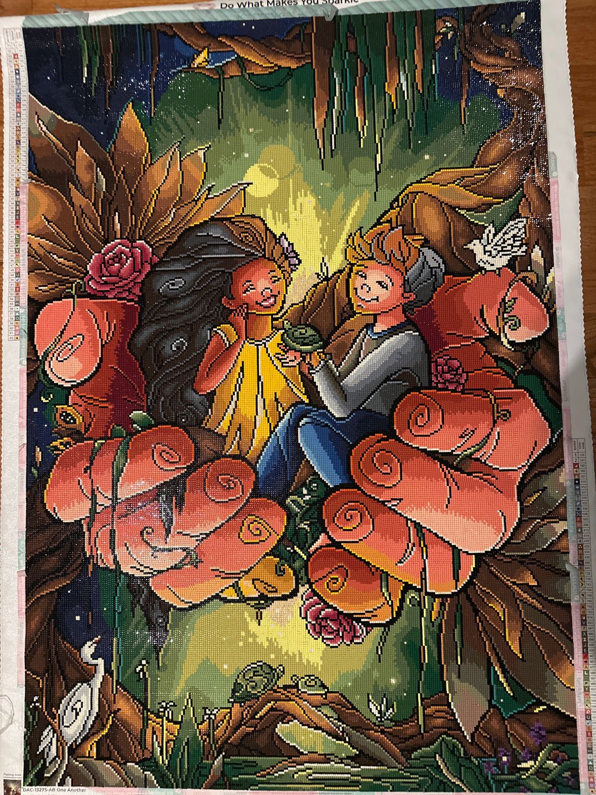 I made a few minor changes. I added grey to man’s hair to match my BIL. I think I changed her lips a bit. I think the bottom fingers (one or two of them) had a shading issue…only a few drills changed. I wish there were frogs because I gifted this to my sister and BIL who love frogs. They love it.