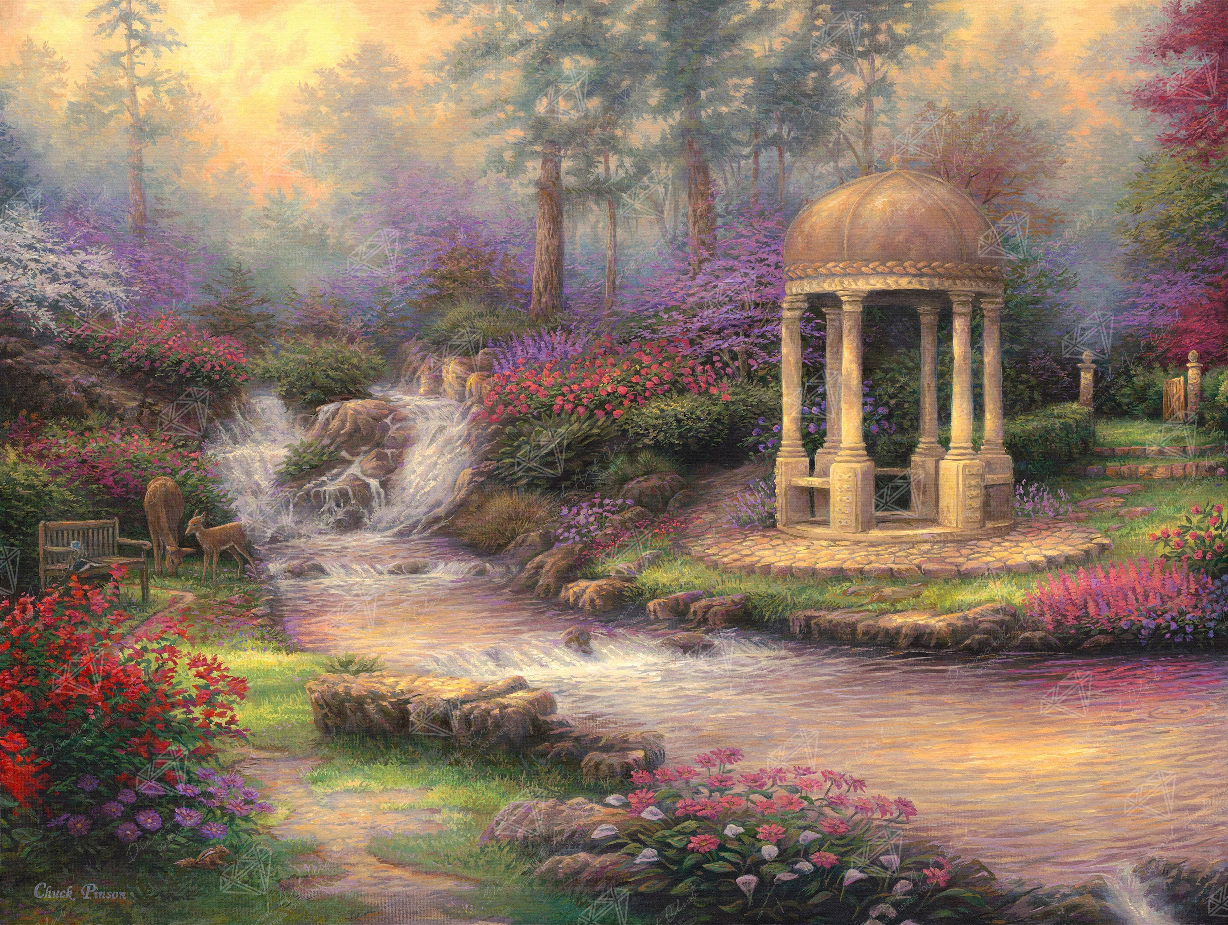Admire the profusion of color blossoming forth in this beautifully landscaped garden on a tranquil day. A bronze rotunda shines in the sun while a sparkling stream rushes by.