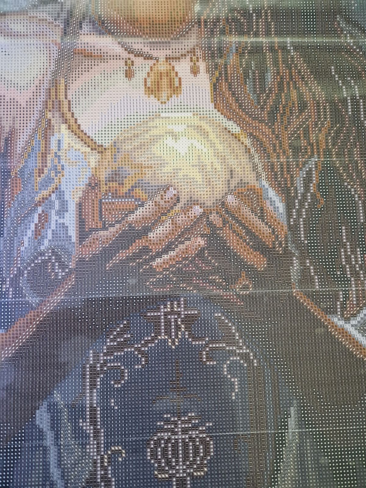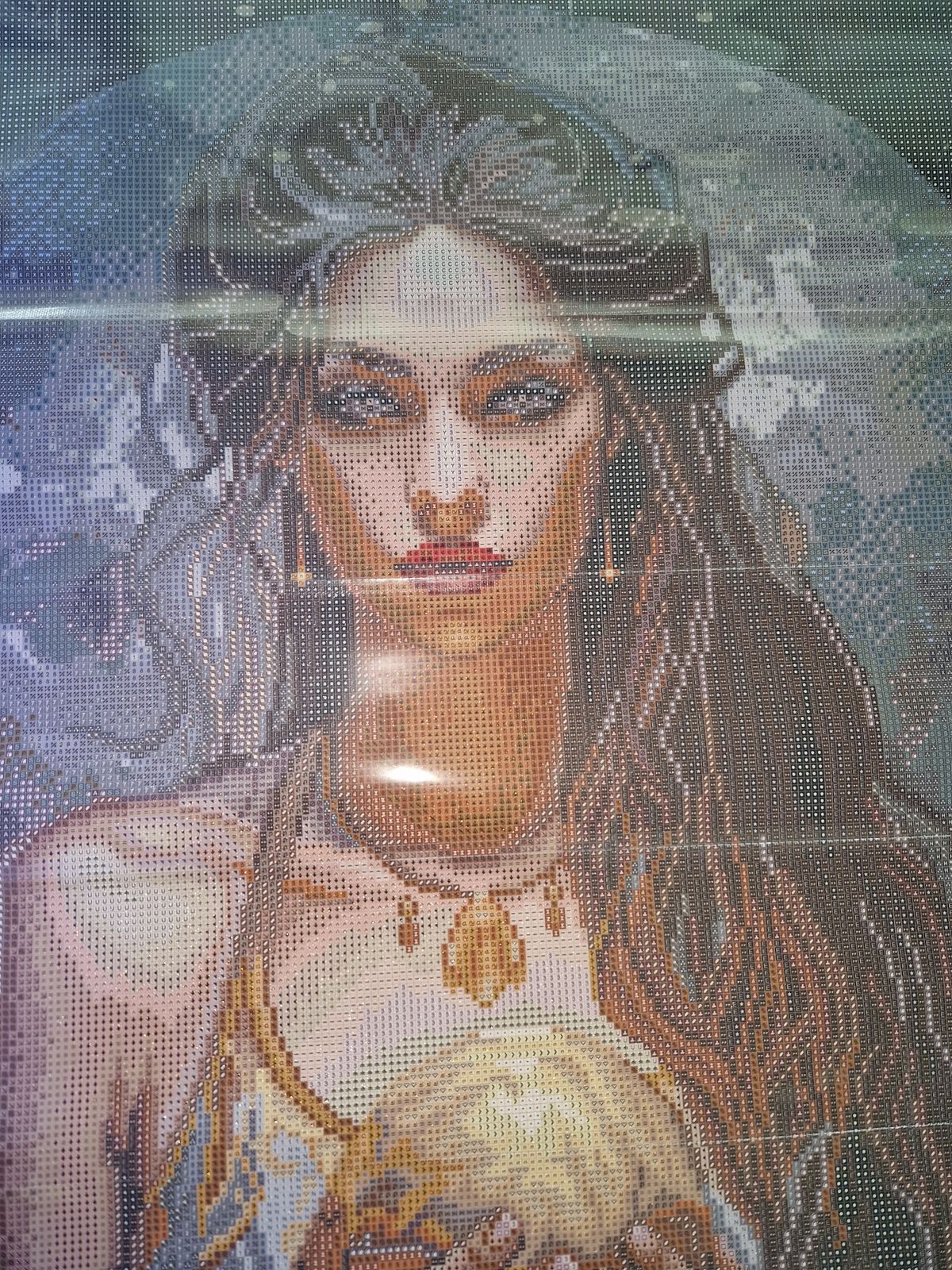 Die Leinwand macht einen hochwertigen Eindruck. Der Druck ist klar und kräftig. Die Symbole sind gut zu erkennen. Eine gute Mischung aus Colorblocking und Konfetti. Wobei das Colorblocking überwiegt. Die Steine sehen schön aus. Gleichmäßige Größe.