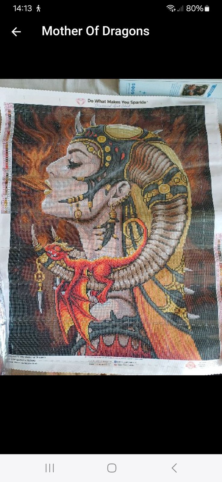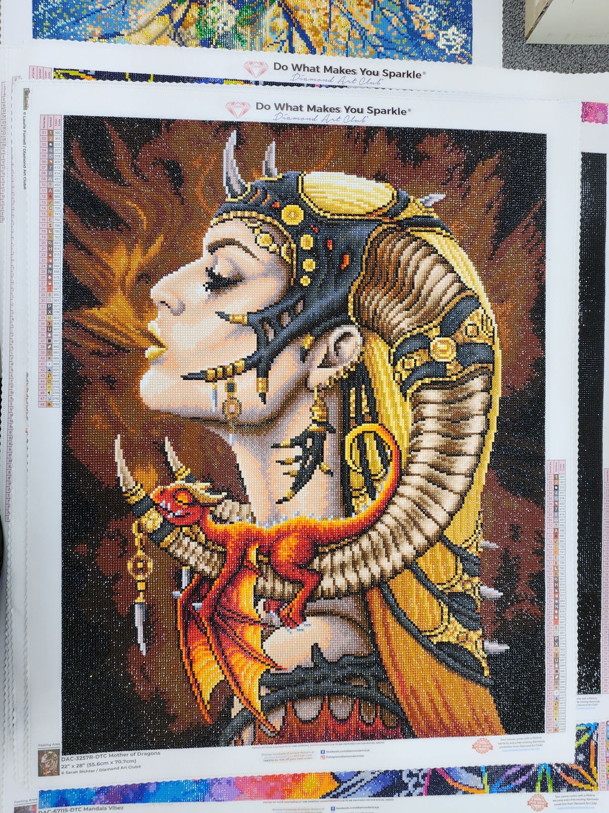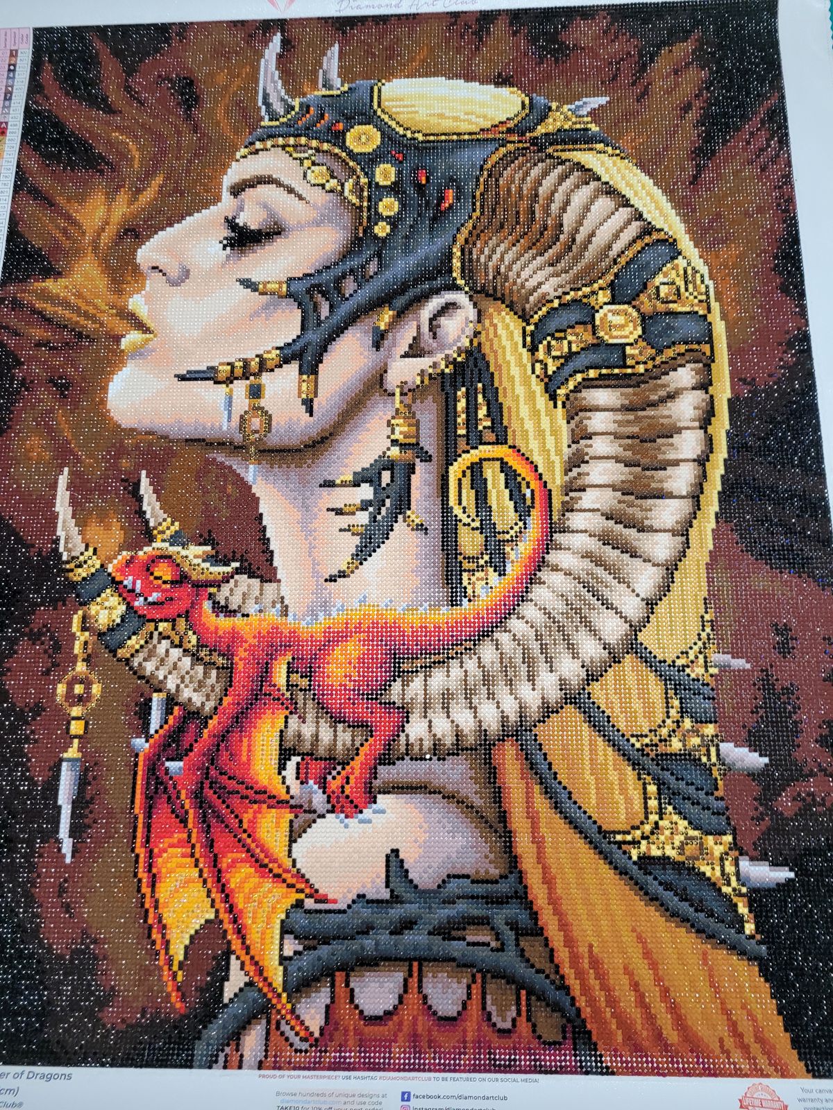 Love it! Adorable dragon compared to such a severe Mother. Vibrant color contrast makes it draw your eyes as soon as you enter the room. Great fun to work.