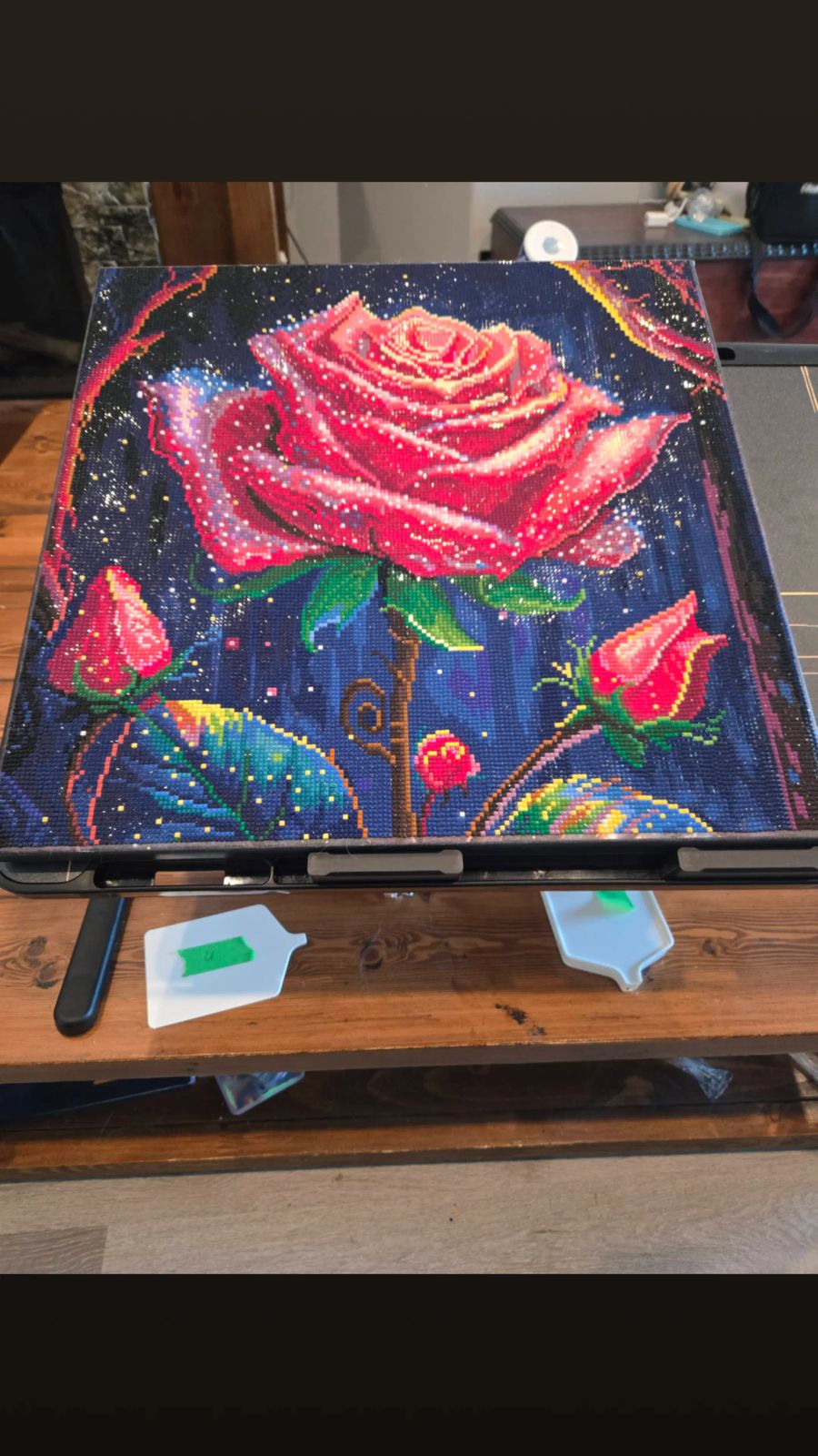 Enjoy the ease of our new Pre-framed Diamond Painting Kits. Blooming over a blanket of snow, a shimmering red rosebush bursts through the darkness. Create this masterpiece and showcase it immediately, hassle-free!
