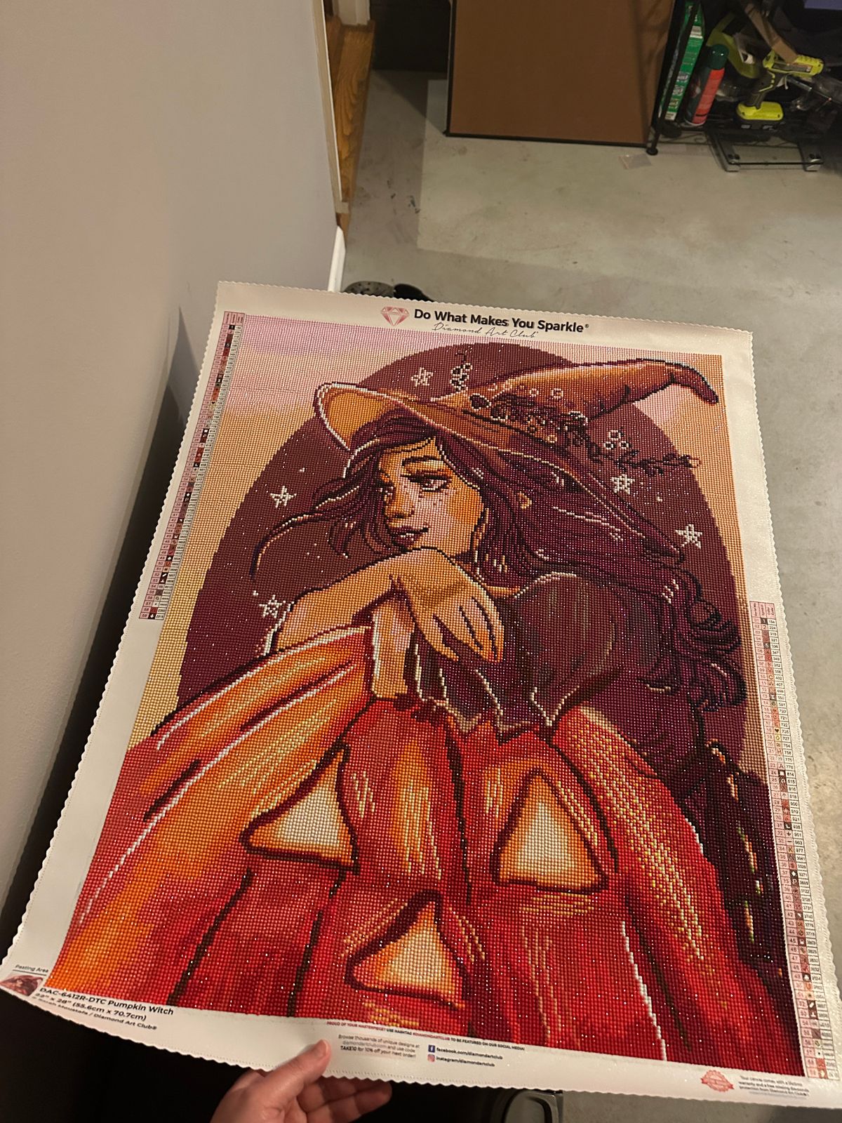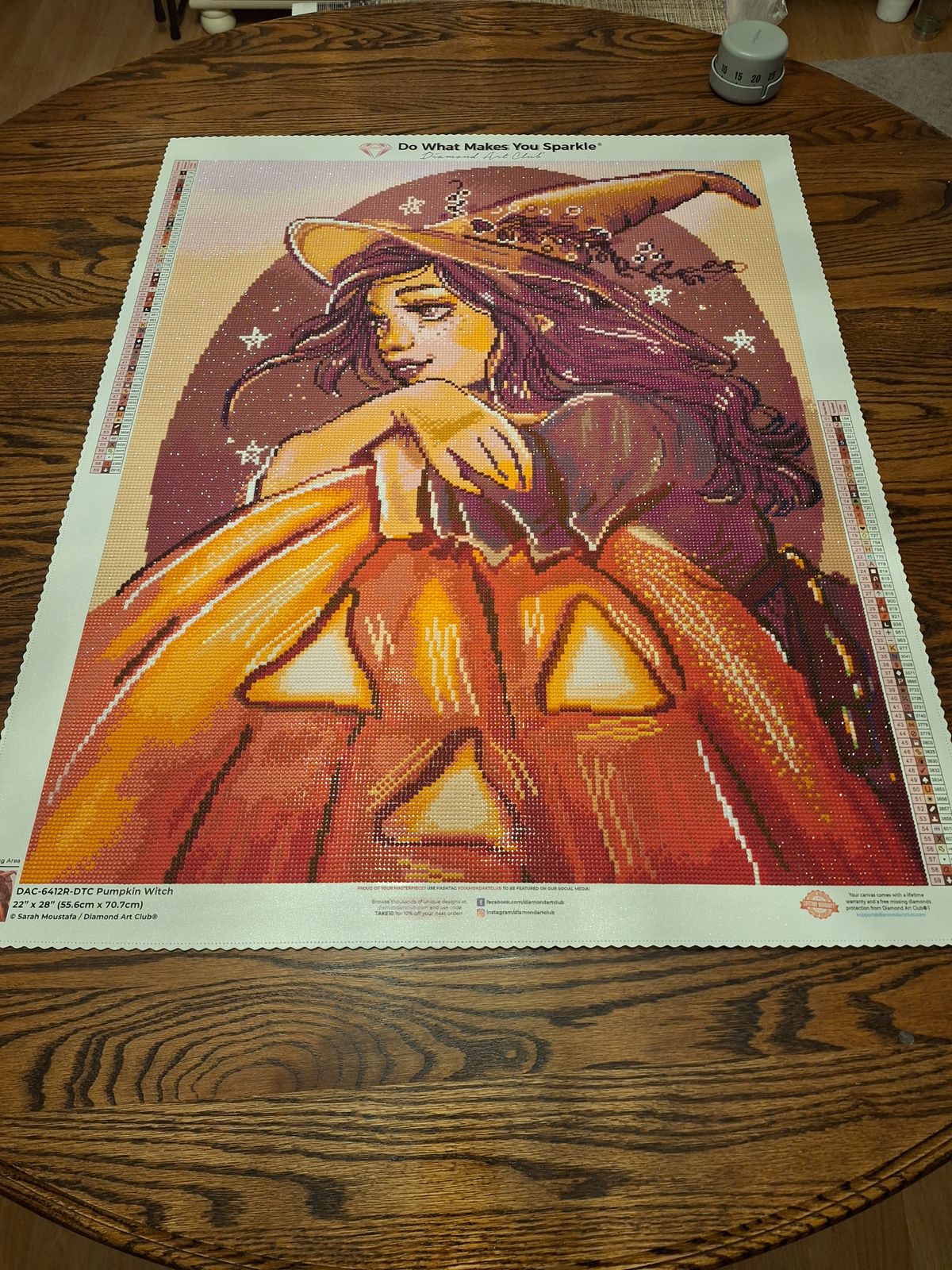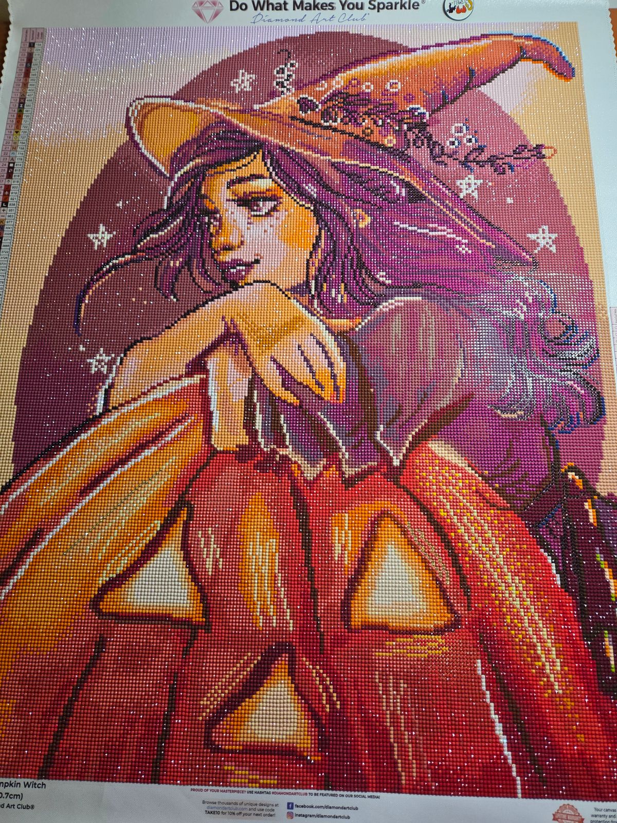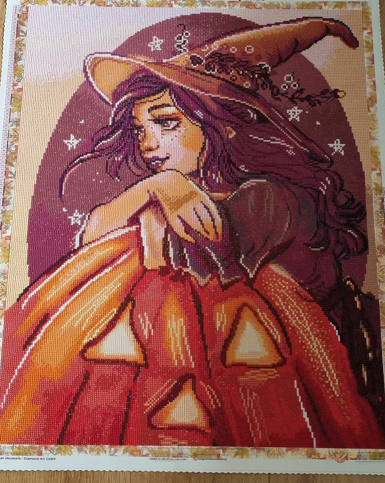 I love Sarah Moustafa’s art and this kit is no exception! Planning to enter this kit for this years’s Drills and Chills event! Can’t wait to start it! Love the fall colors and the witch’s face is adorable.