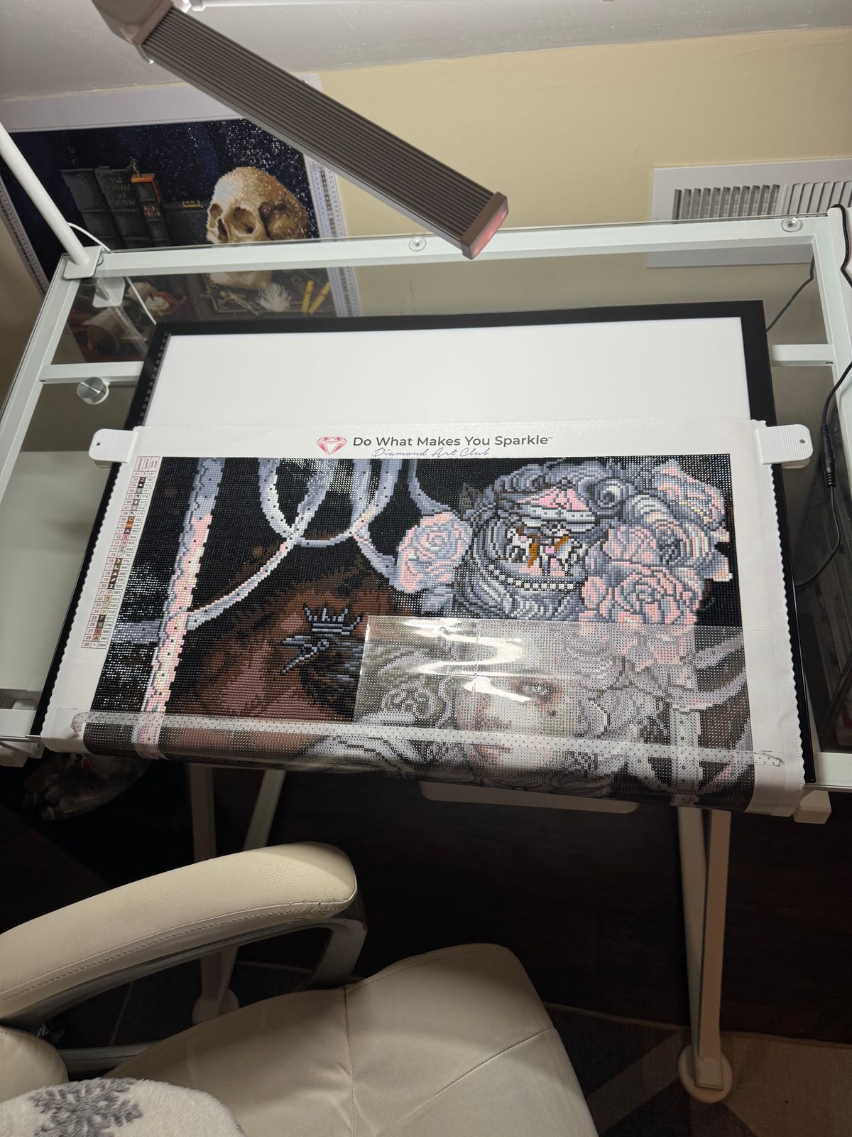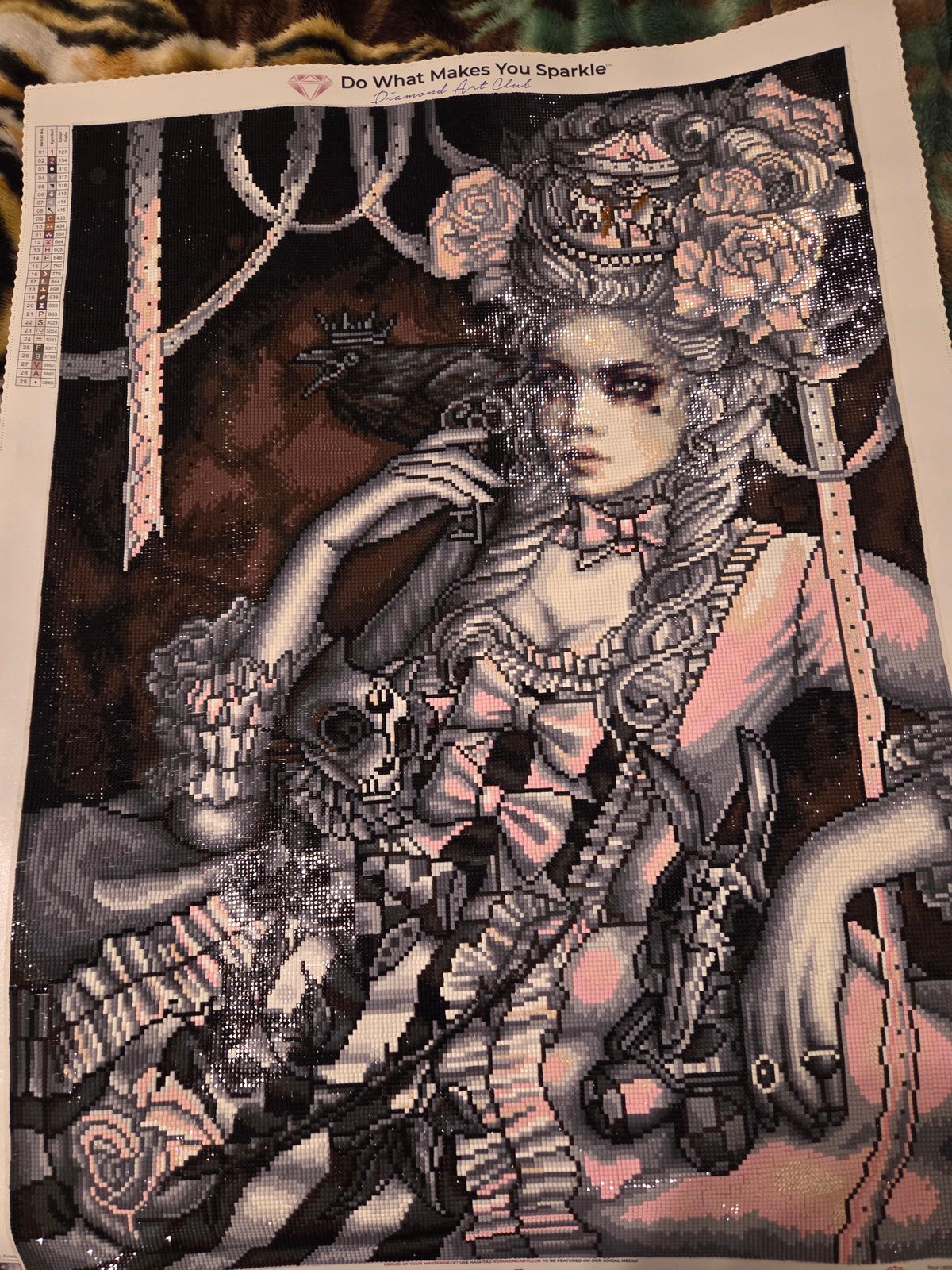 I am one of the people who actually like the more dark styles of art work and I love the artist Enys Guerrero is the only artist I have gotta many diamond paintings from because each time I get them they don't disappoint. This one is no different Rococo Dream is one of the diamond paintings I wanted the most to work on and I am so happy I got it I love everything about it i love how because there's more dark colors it makes the other colors stand out. 10/10 if you like dark style of art work I differently recommend getting this one.