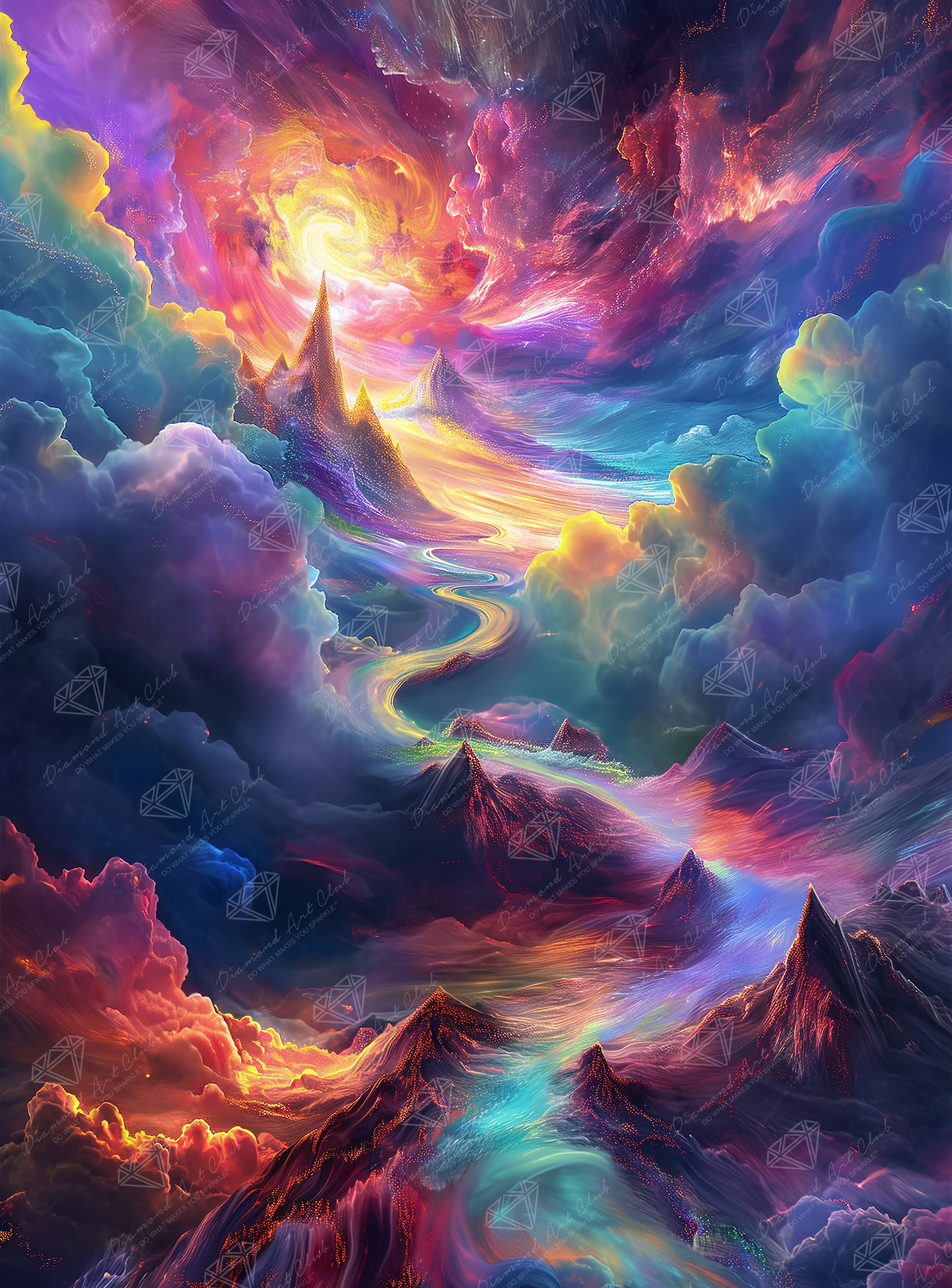 Chase the storm of swirling colors through rivers of light twisting through ragged mountain peaks. Follow the spiral’s pull into realms of endless motion and mystery.