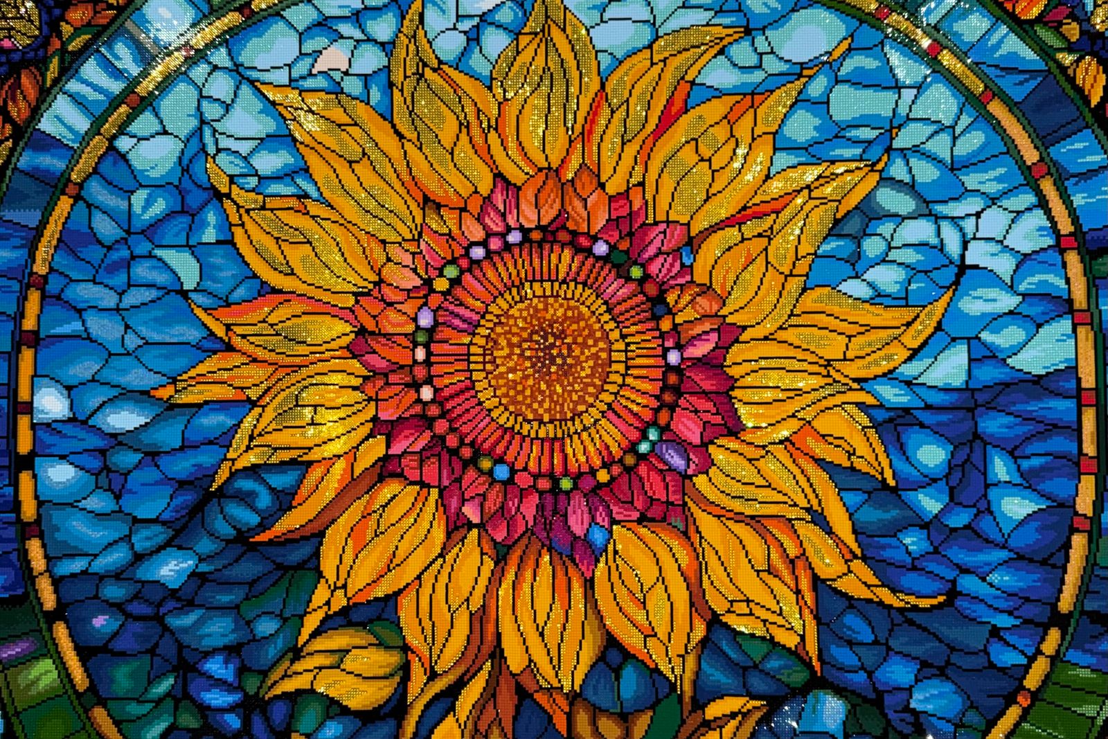 Bask in the vibrant glow of this singularly radiant sunflower! As the hues dance through each glittering panel, feel a brightness wash over your space and spirit.