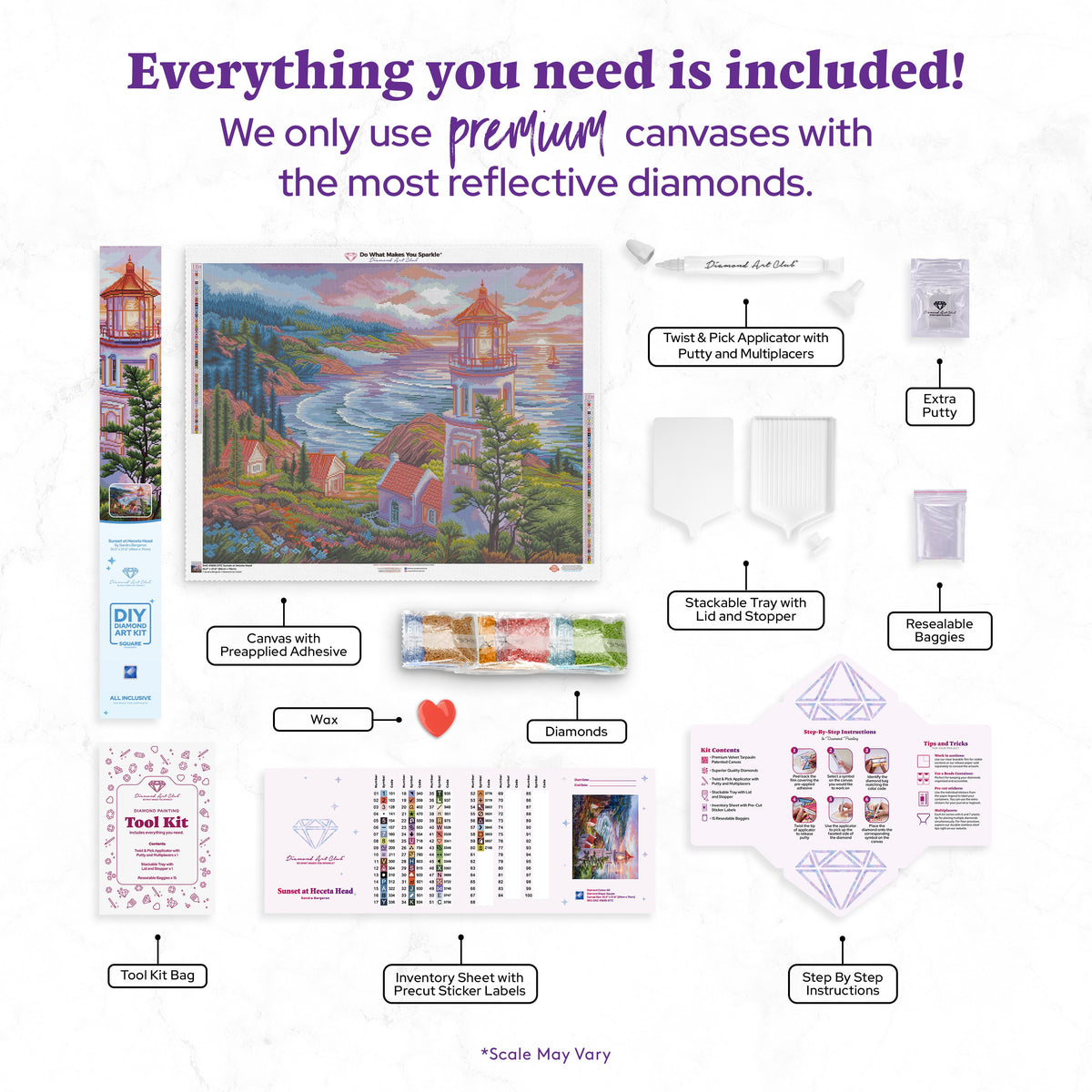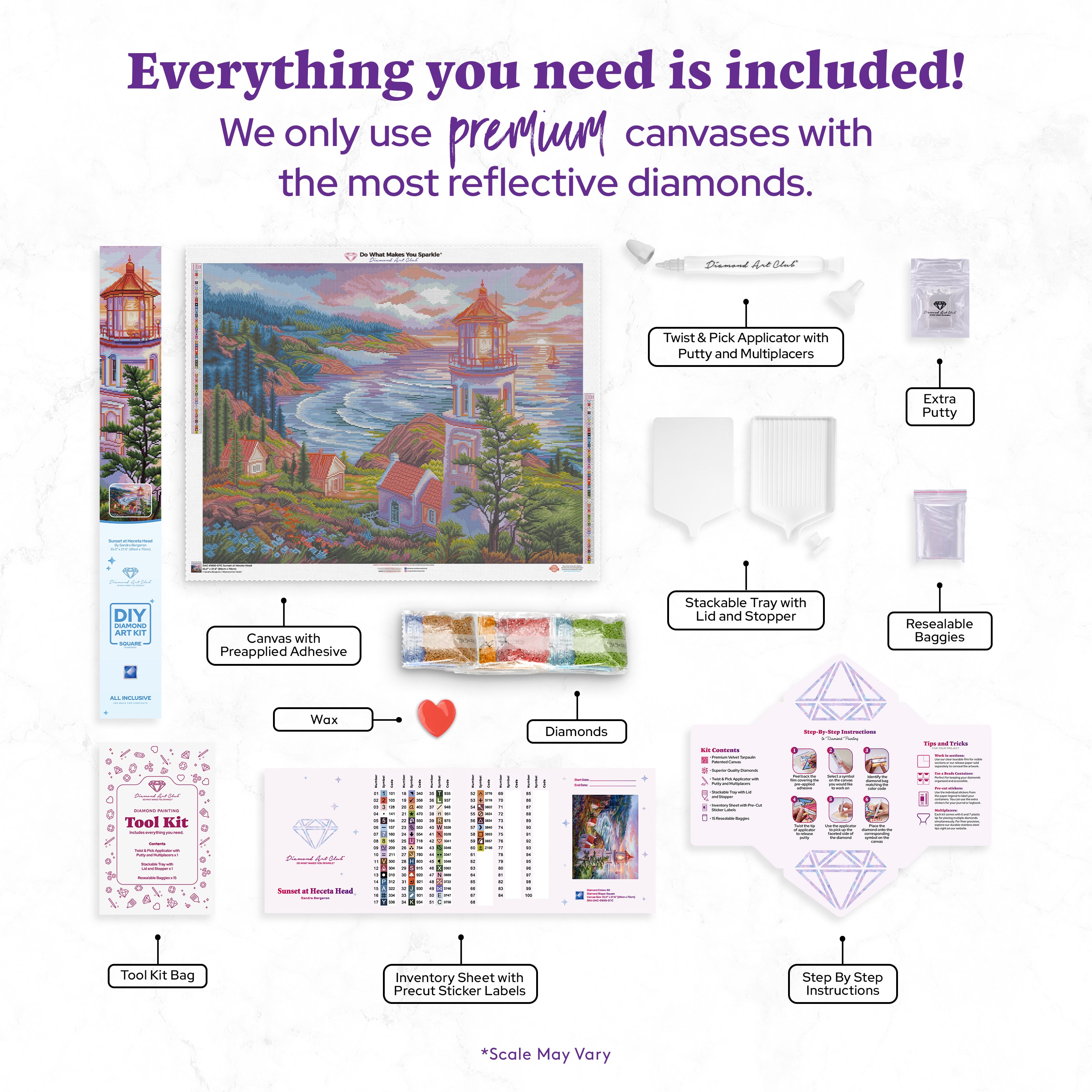 Canvas x 1, Diamonds, Tray x 1, Applicator + Grip x 1, Wax x 2, Tweezers x 1