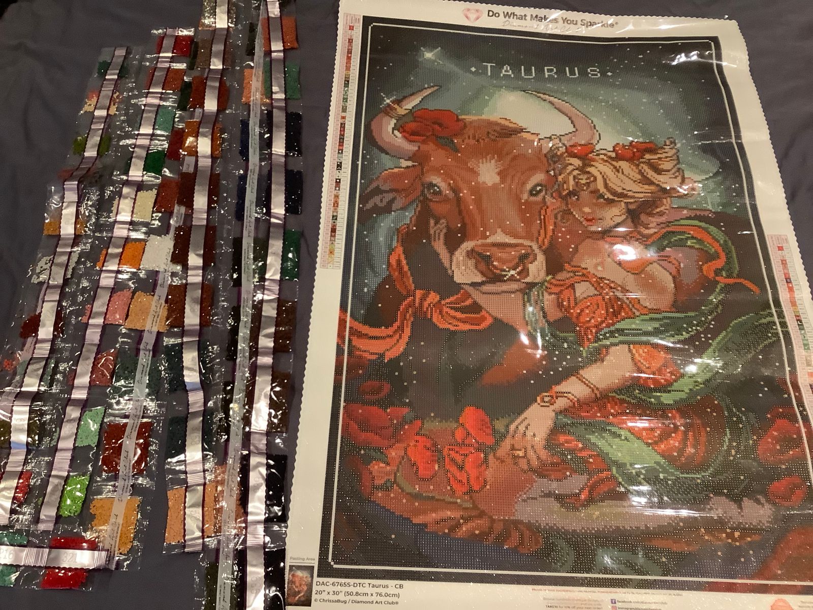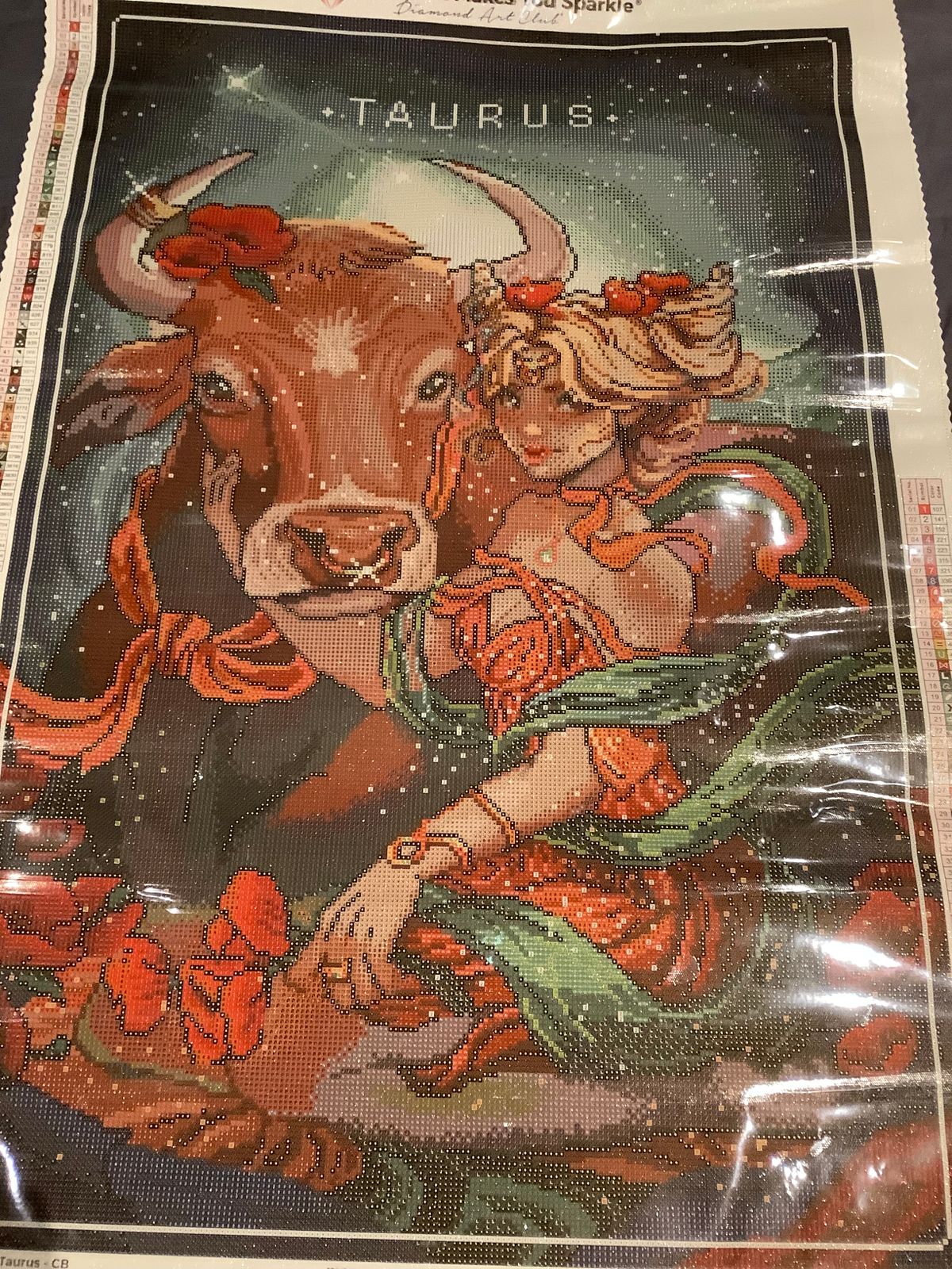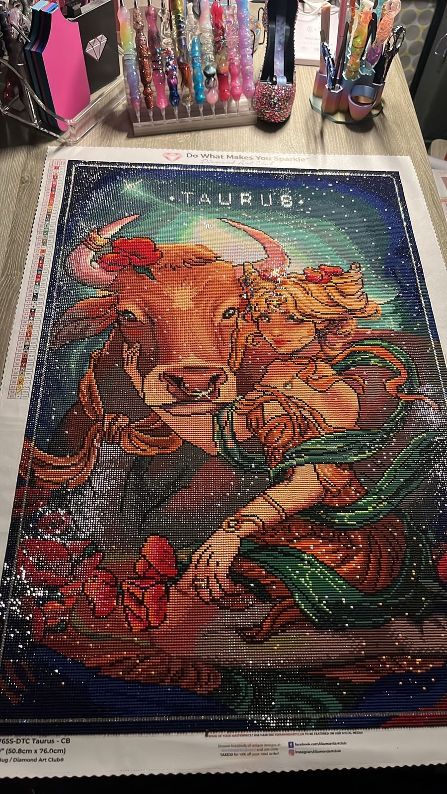 I have been on the edge of my seat waiting for a Taurus painting, it’s so pretty and it even has silver sparkly gems! I cannot wait to start this beautiful painting.