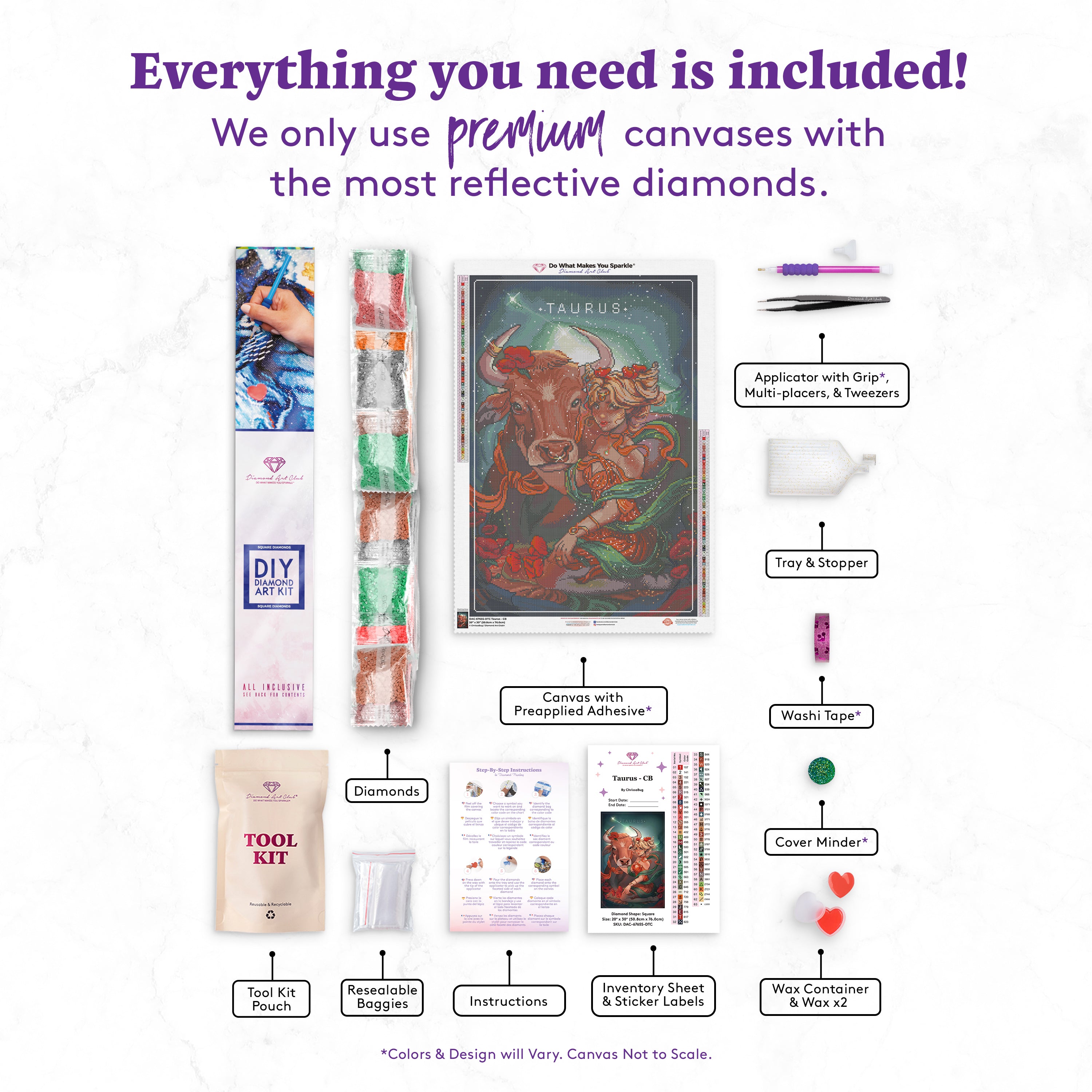 Canvas x 1, Diamonds, Tray x 1, Applicator + Grip x 1, Wax x 2, Tweezers x 1