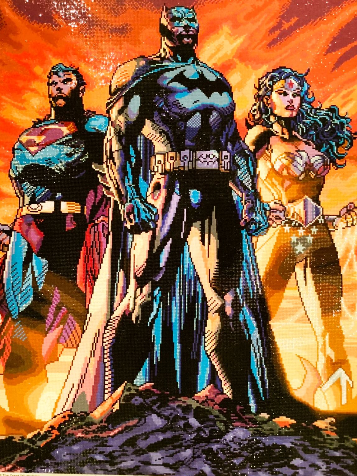 I was very excited and anxious as I unfolded the canvas. It was beautiful enough IT could have been framed. This project took about 2 1/2 months at about 6-8 hours daily, including a break and lunch. As far as working on this, I found it very challenging as so many shades of colors are located close together, As I got further into it, I saw Superman’s and Batman’s legs appear (I work from right to left). When I ended each day I’d stand to get a look at what I’ve done and how the project colors look, and boy do the colors get your eyes.