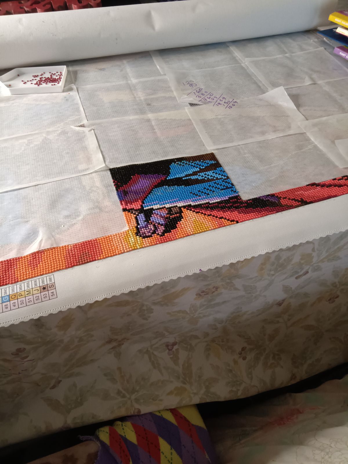 This is my first diamond painting EVER. I was worried that I set myself up for failure by choosing this as my first. Nope. I'm loving every second of it! I find myself looking forward to diamond painting for a couple hours after a long day at work. I feel less stressed too! This is my progress after 3 hrs of kitting and almost 20 hours of painting.
