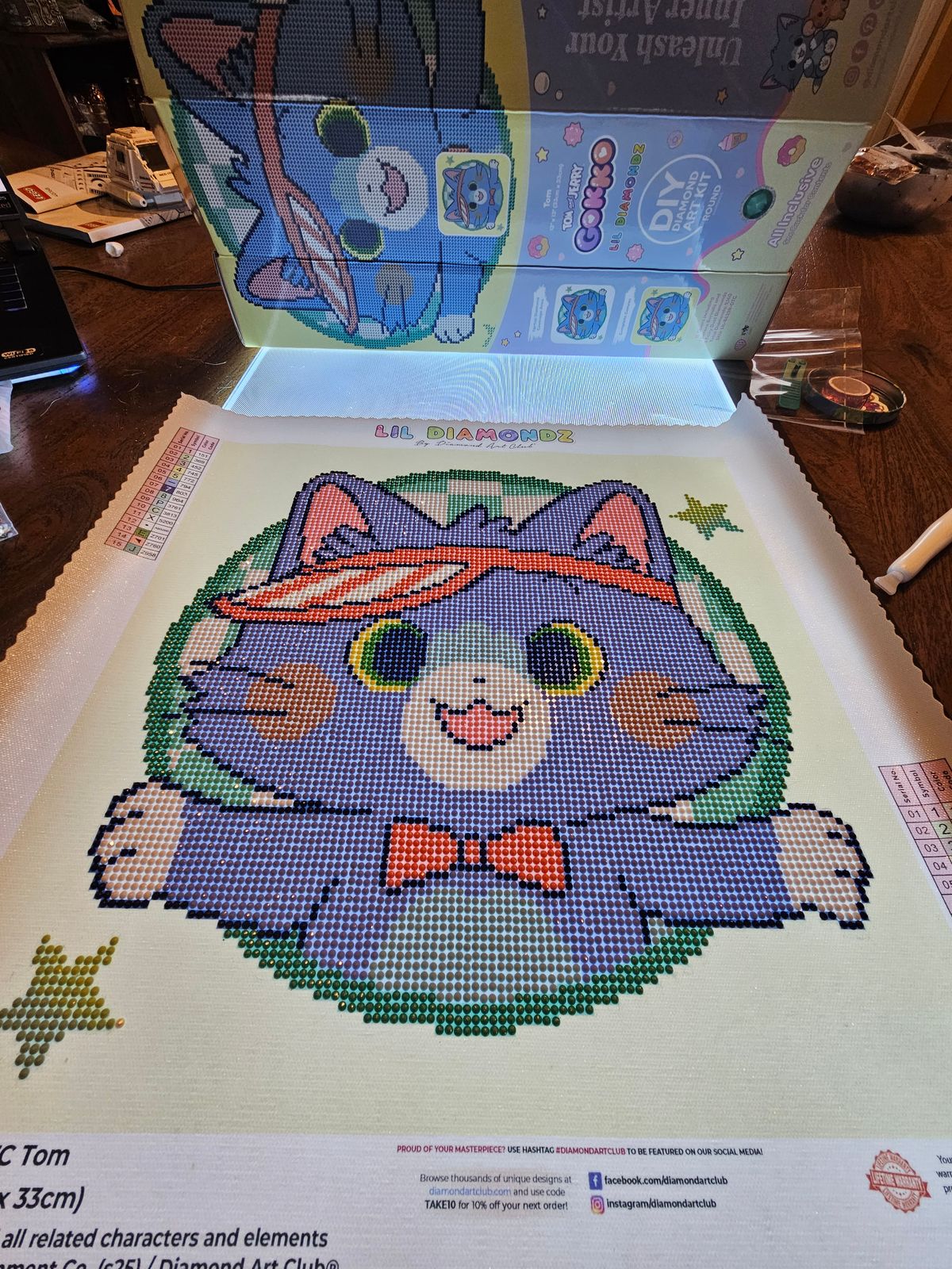 I love this little Tom partial painting. Super cute, love the colours, and the round drills are so sparkly! I have all three in the set and plan to put them up in my kid's playroom once I've finished them all.