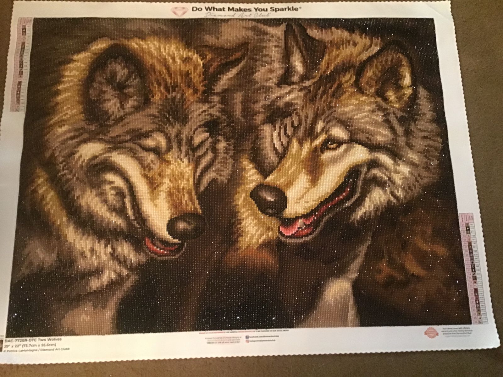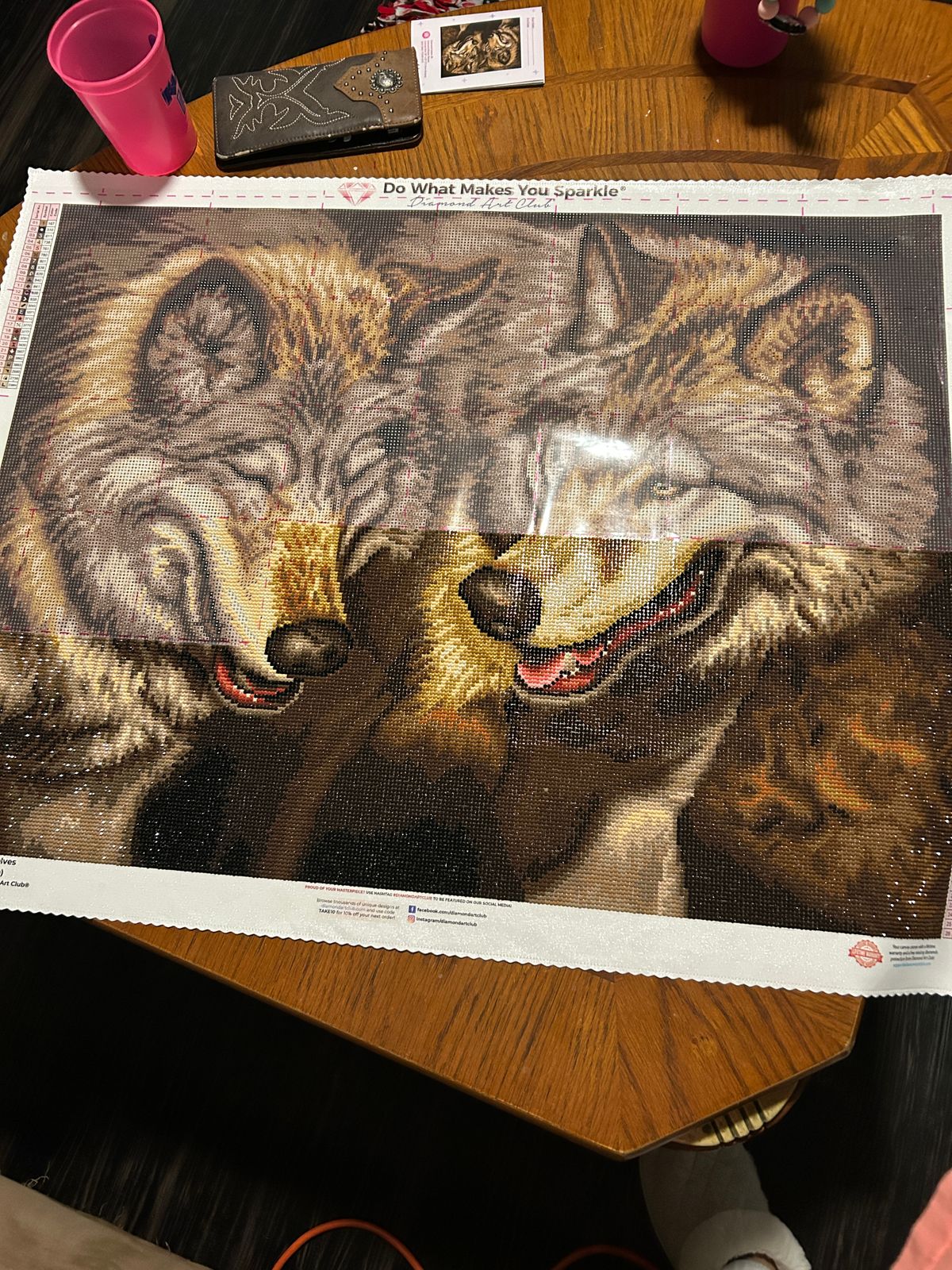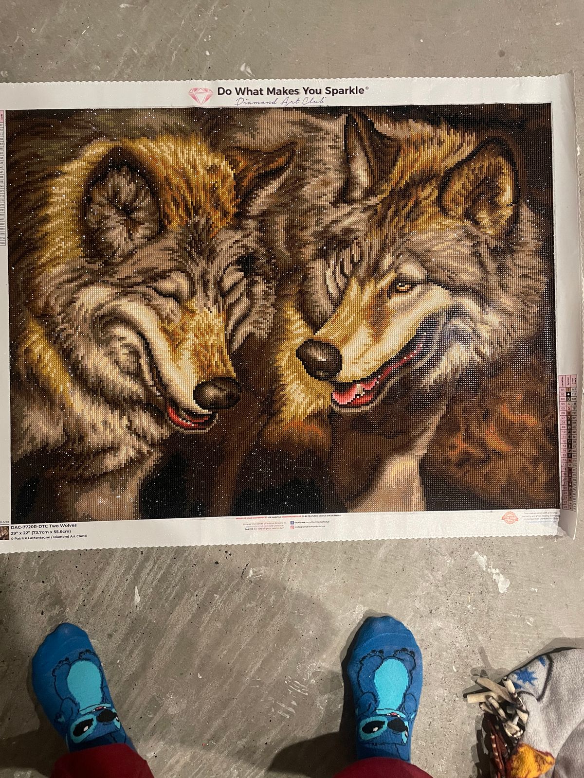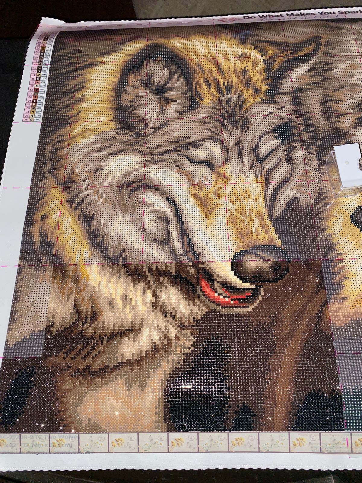 This painting is so realistic! It's so sparkly and was so much fun to do. I love the plastic film that is sectioned so you can tear it off and not have to cut it. Im waiting on the next wolf painting to be back in stock as I'm doing a room with Wolf paintings.