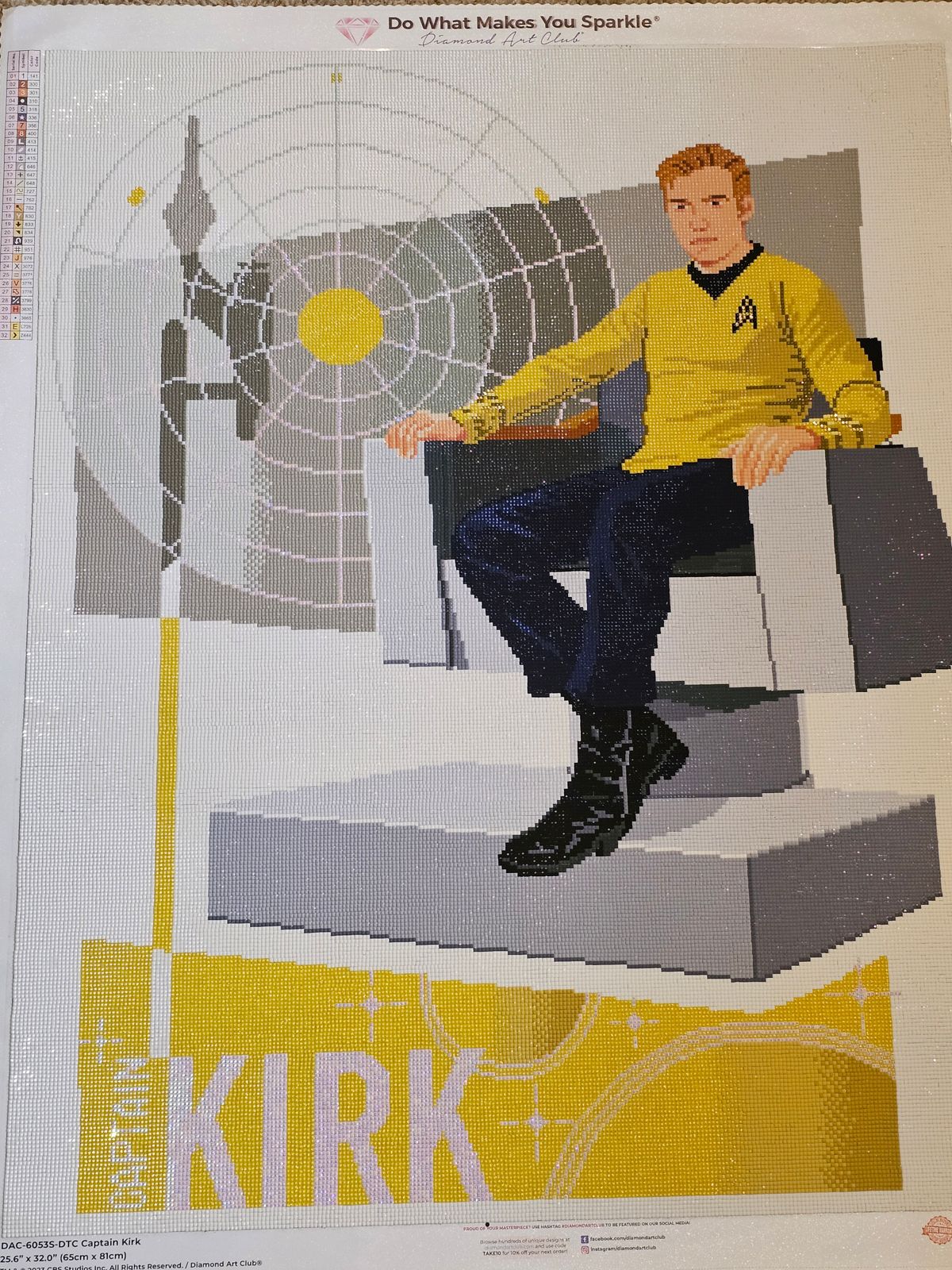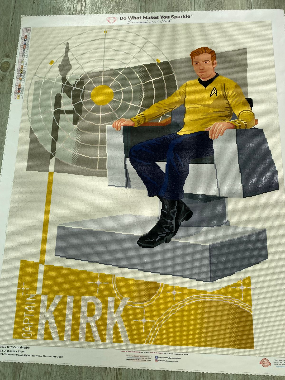 I needed Kirk to complete my trio. The finished product looks nice. I love the yellow fairy dust. My biggest problem with this painting is the large quantity of blocking. I like having a nice mix of blocking and confetti.