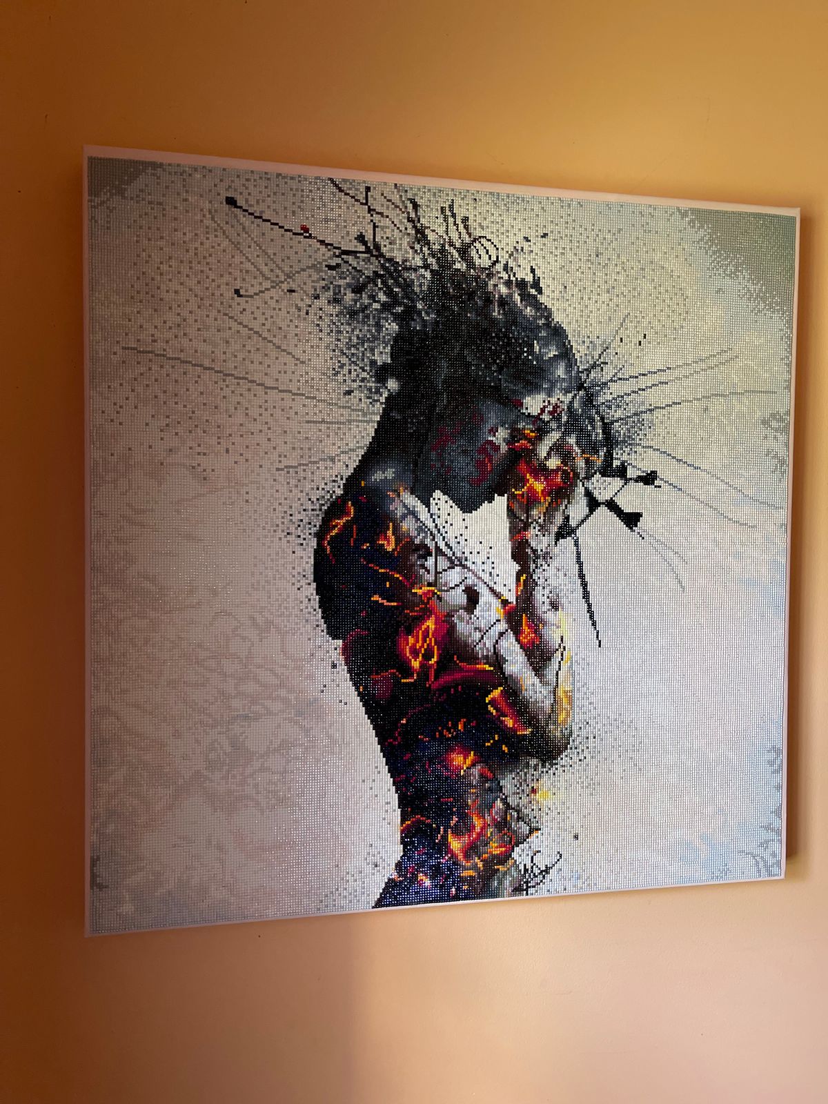 I purchased this painting because I felt it was a great representation how I've felt dealing with certain things I've been through. This painting is almost completely confetti. The background was a bit boring to do because it was compromised of the same few colors repeated. But I love the image so much that it was worth the effort. The drill quality was excellent and the finished picture looks amazing.
