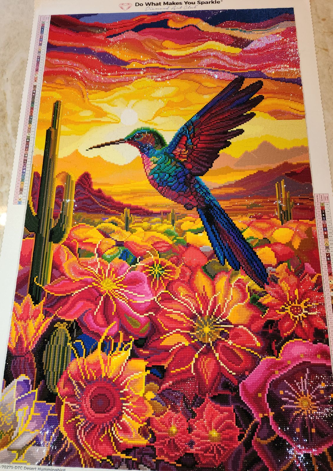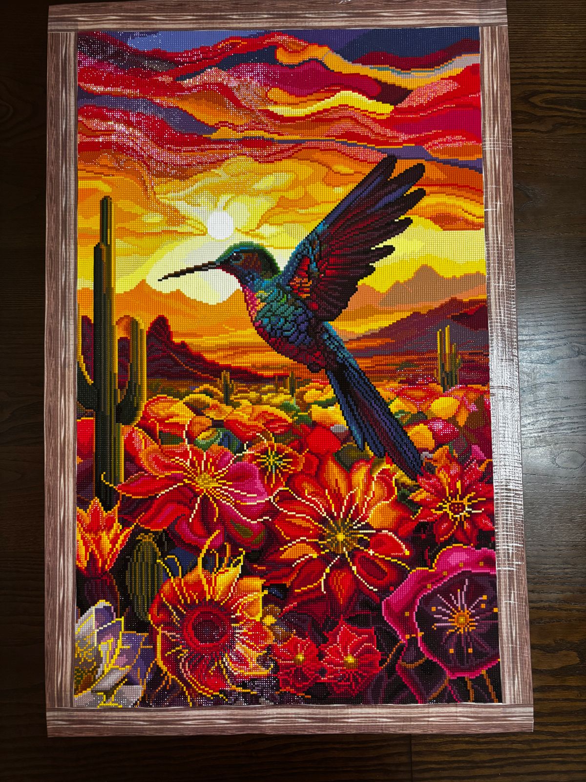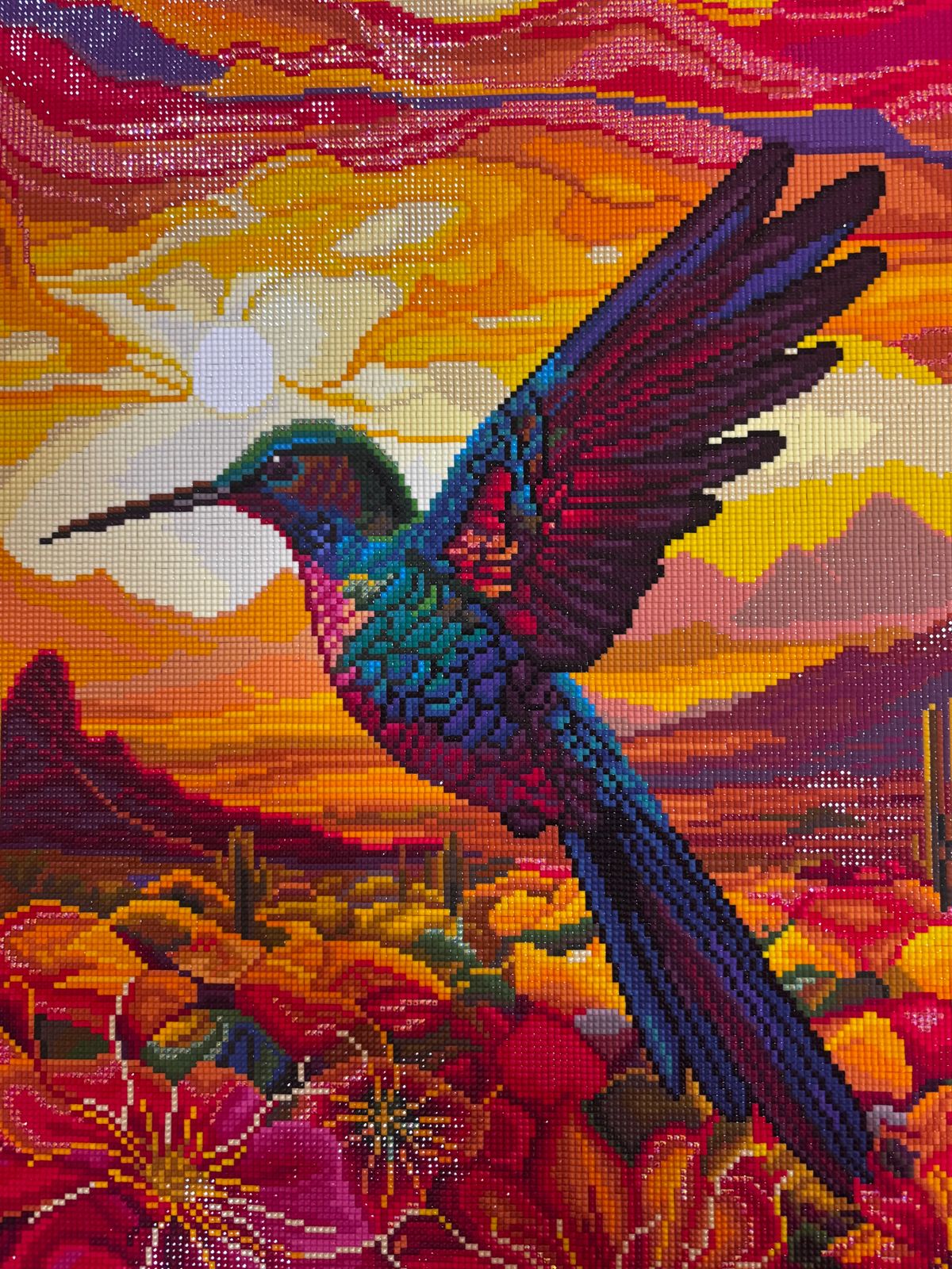 I, myself, live in the desert and often have hummingbirds that visit my feeders. This art truly captures the beauty of the desert and the fact that we get the most amazing sunrise and sunsets that I’ve ever seen. Great drill quality, drills fit together nicely, and all areas of pored glue were cured. This one was such a pleasure to work on.