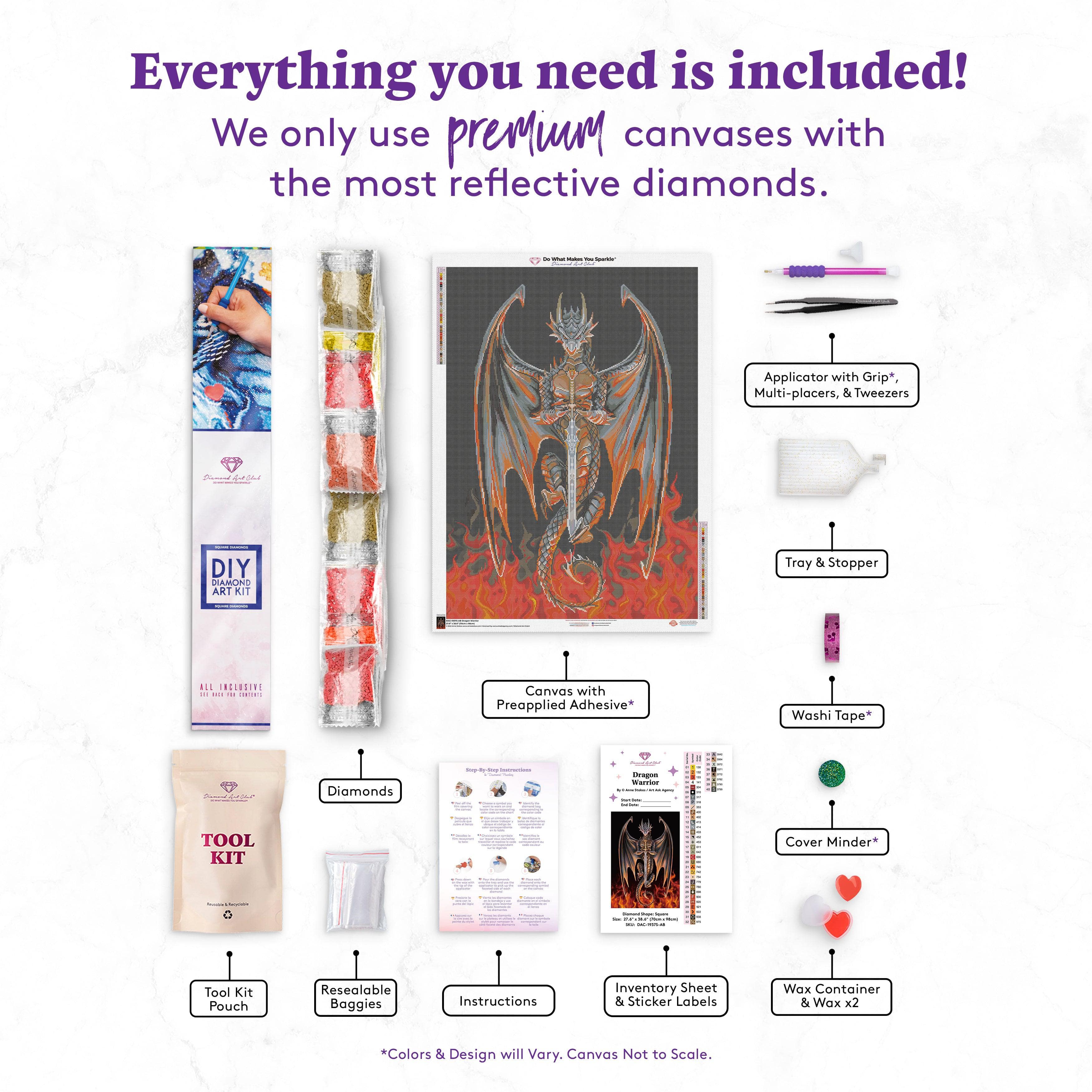 Canvas x 1, Diamonds, Tray x 1, Applicator + Grip x 1, Wax x 2, Tweezers x 1