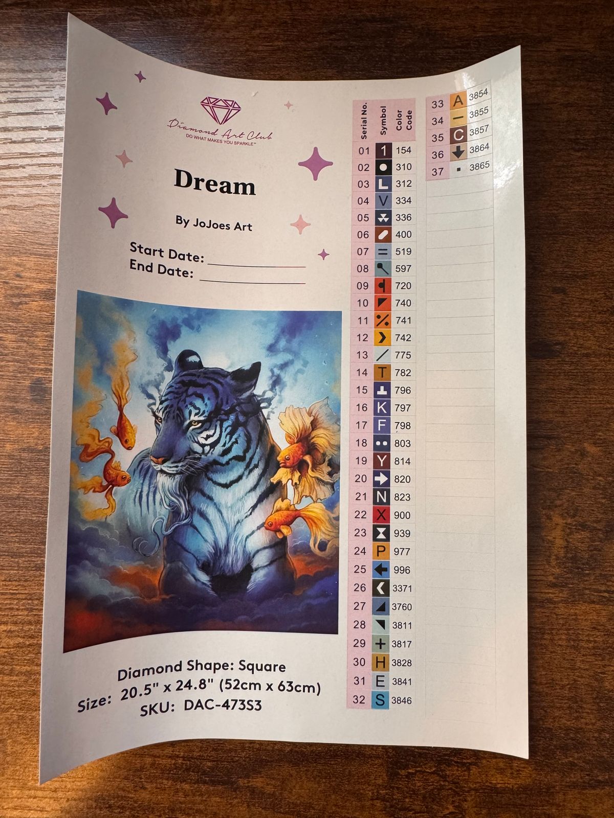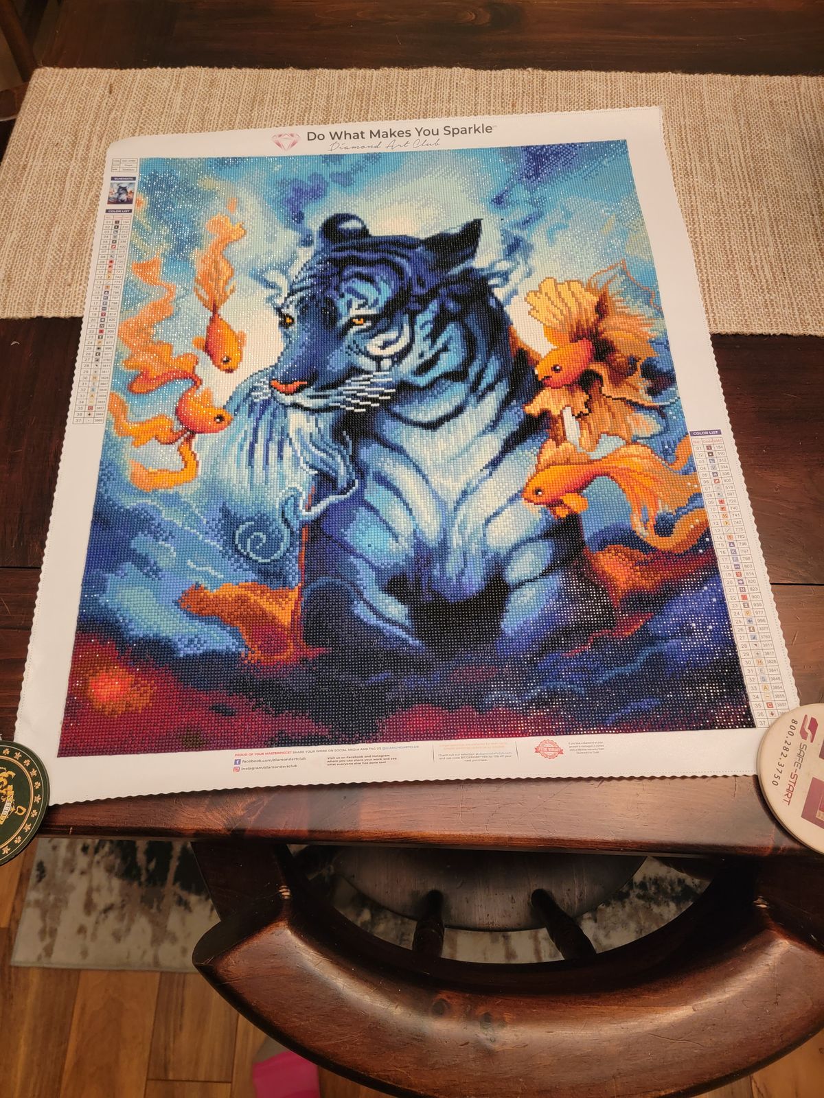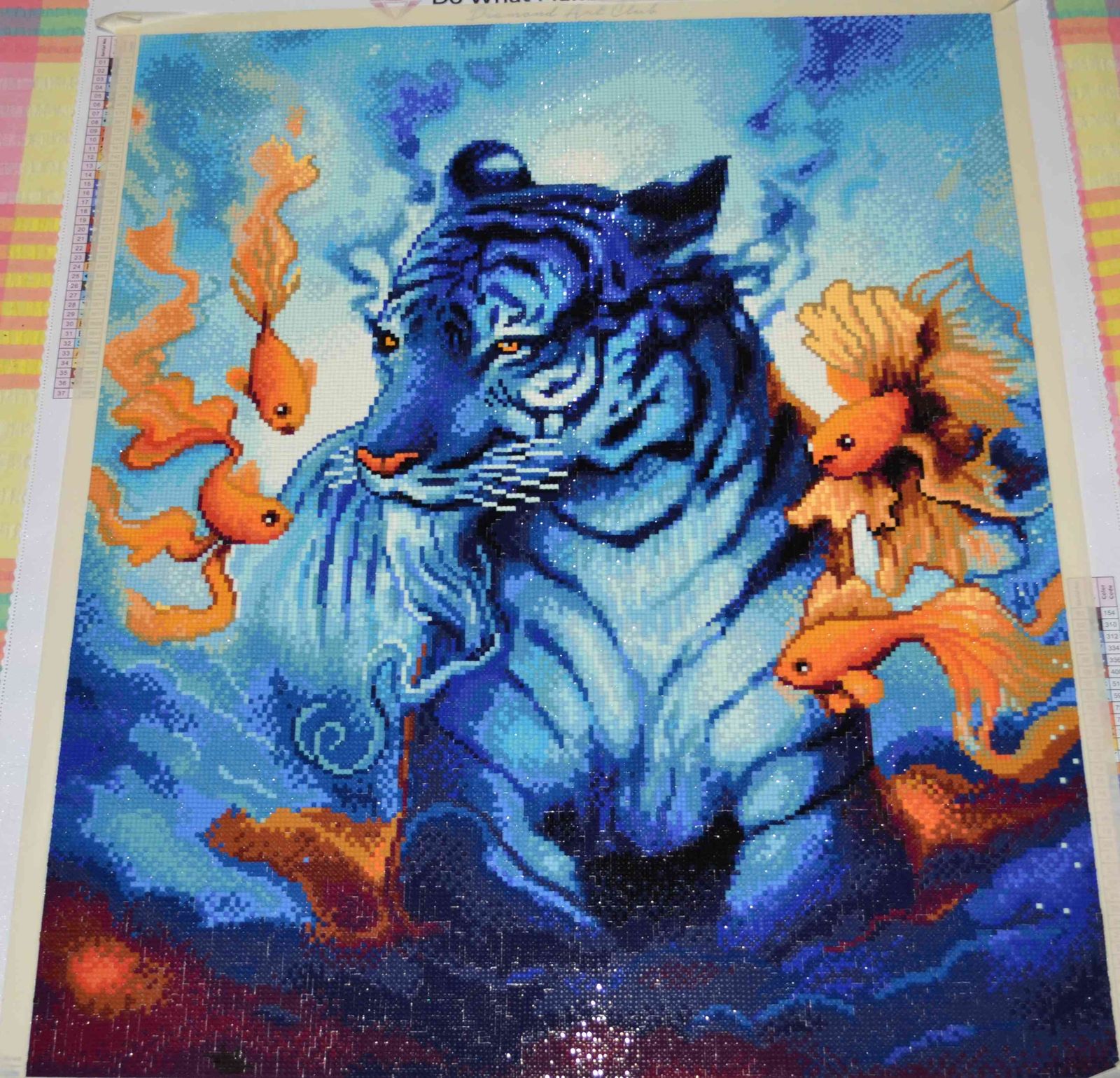 My favourite images are animals in particular love the big cats. So this one fell right in my wheelhouse. As it is an older kit (published prior to DAC including AB's in kits) there are no special drills. I really do wish I was more creative then I actually am, Spent a long time procrastinating about how to include some AB's and Fairy dust, but too many doubts about where to include them, so finally bit the bullet and did it anyway. I still very much like the way that it has turned out and would recommend if you like the image and working with blue drills. Also I wanted to mention I am a very slow diamond painter and so whilst it did take me over 80 hours to complete, a normal diamond painter would take far less.