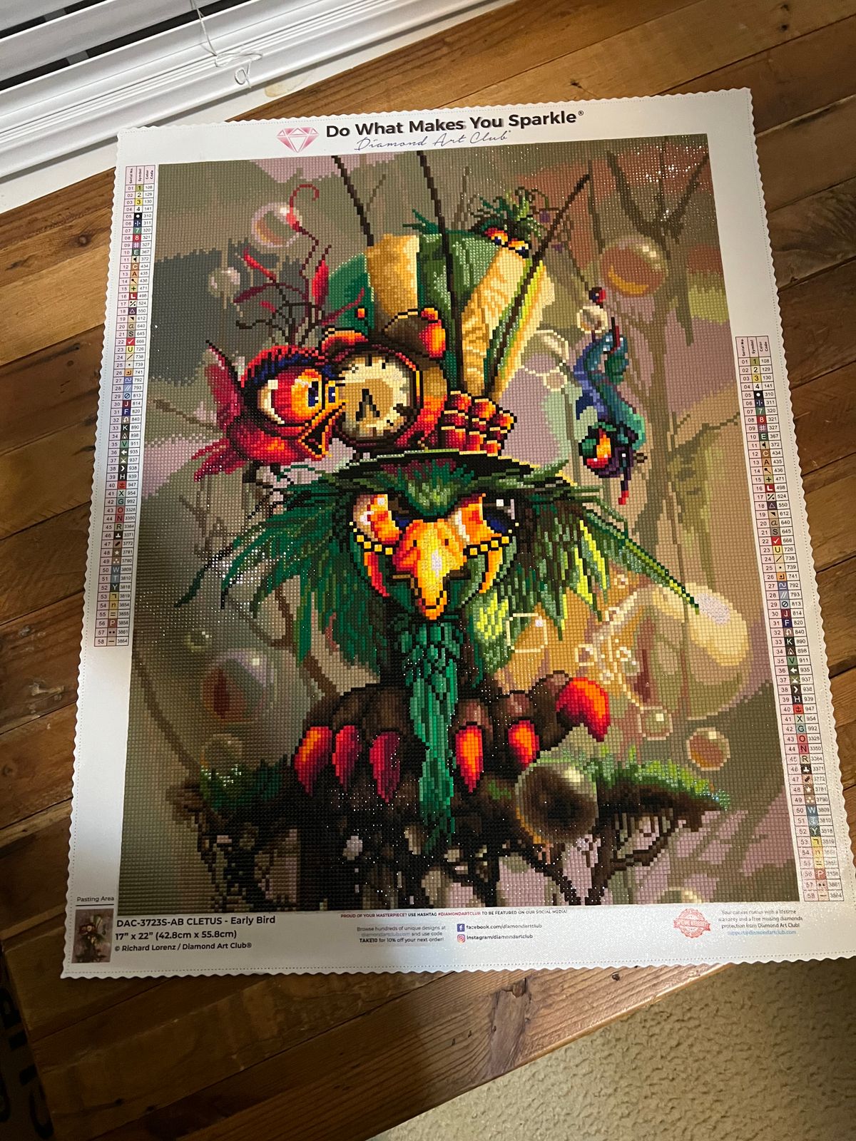 A square 17” x 22” or 42.8cm x 55.8cm canvas. It had 58 colors and four were the Ab drills. There was no fairy dust as this is a kit from 12/23. I didn’t add any extra to the canvas either. It was enjoyable to do and I completed it in 8 days. This was my first bigger Richard Lorenz as I did the small canvas from Amazon of one of his birds before this. It’s colorful, drills were good.