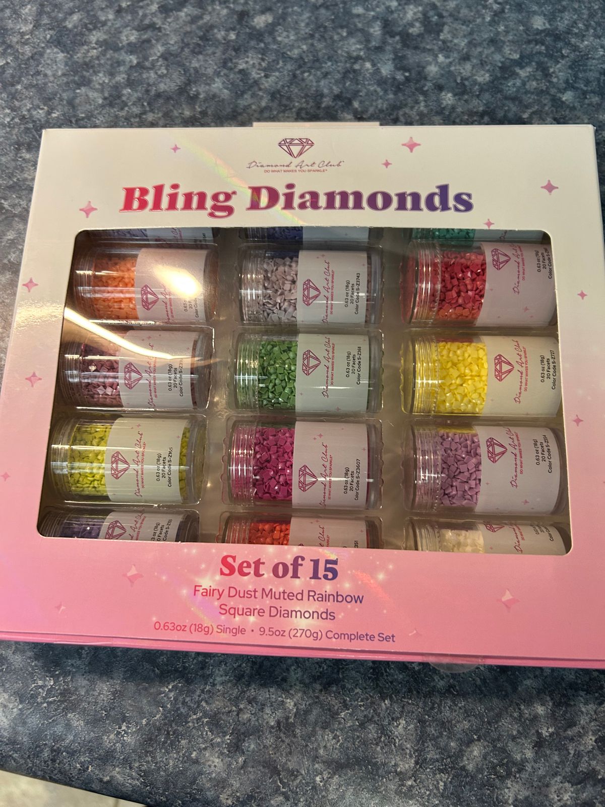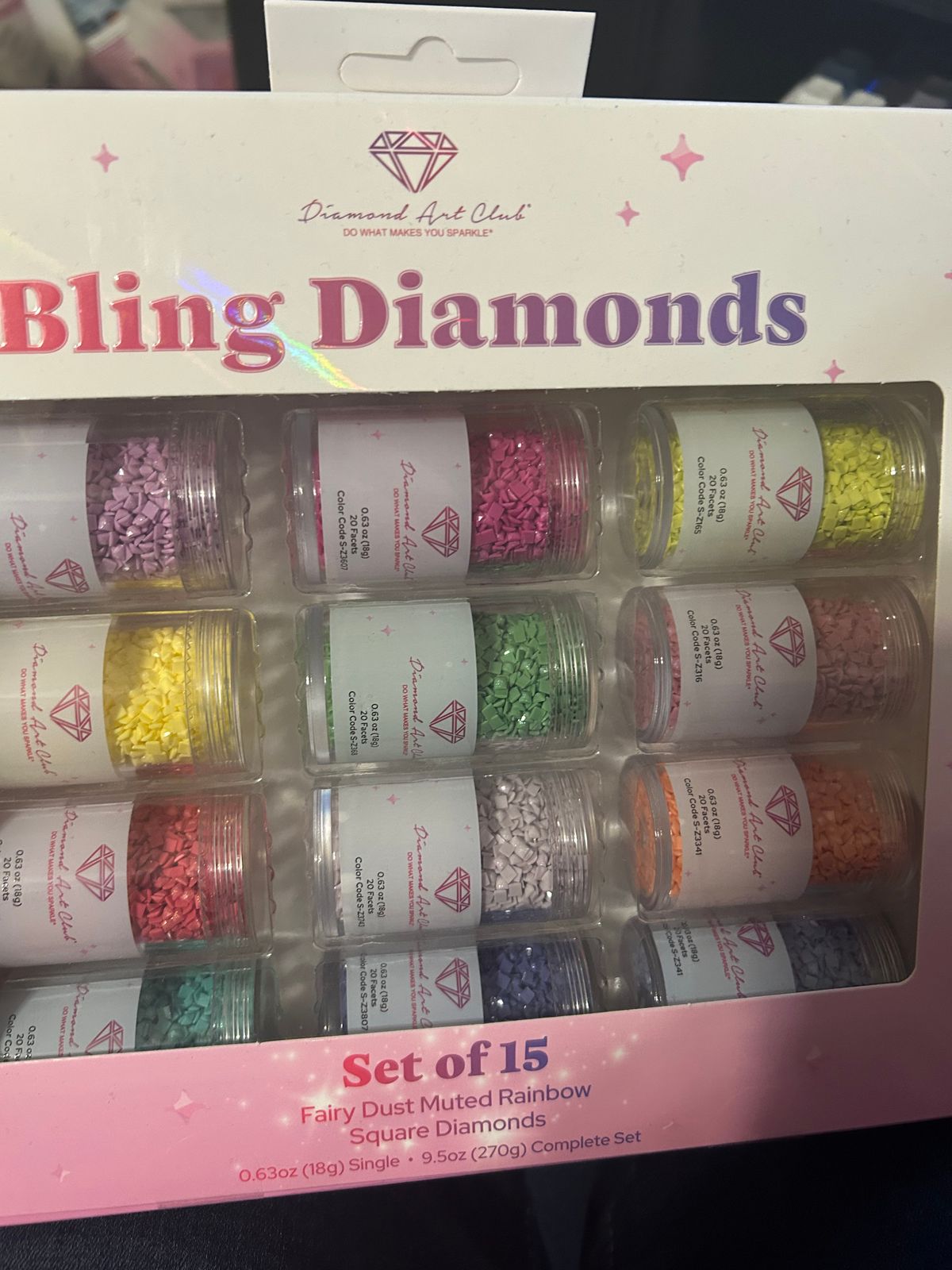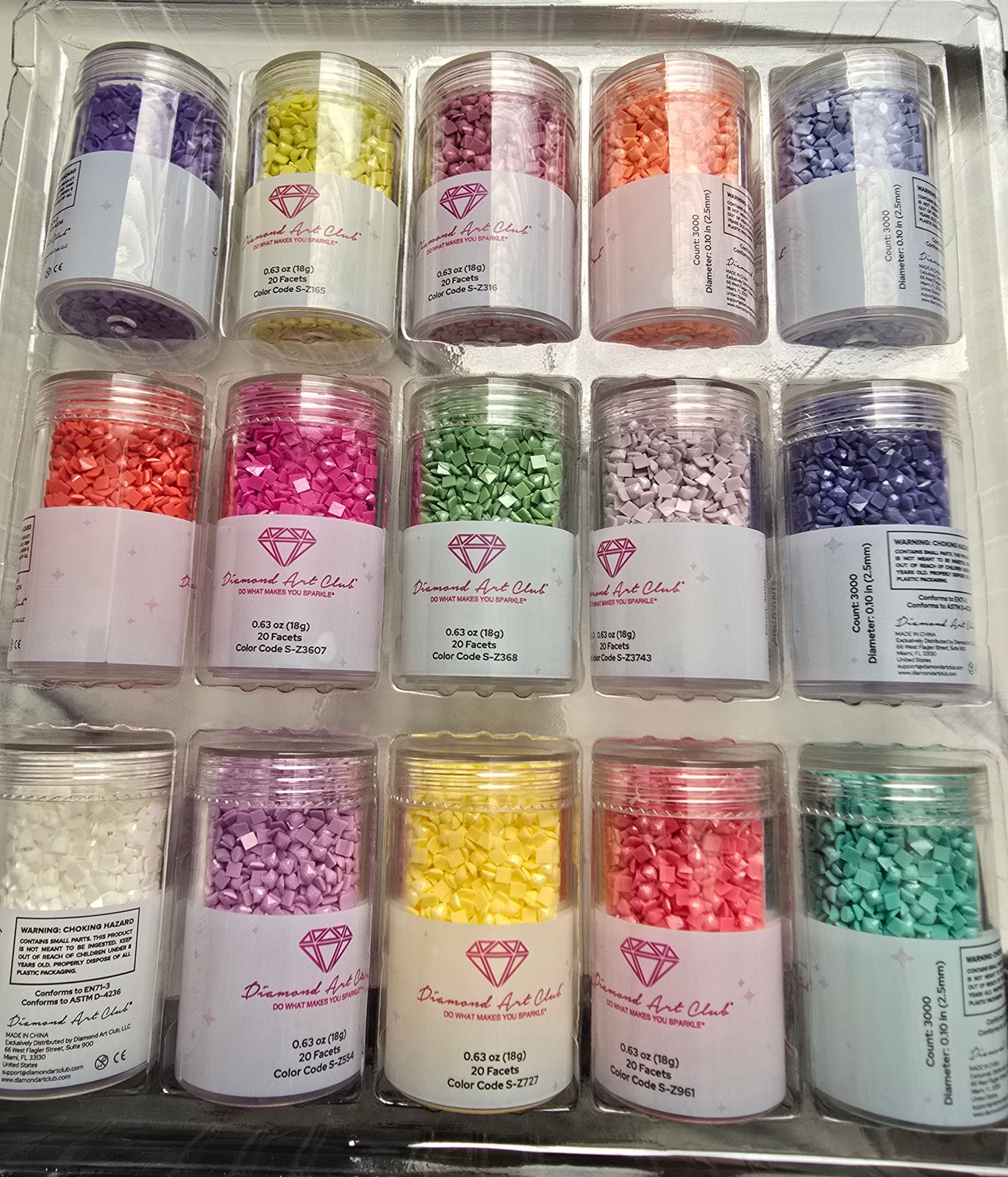 Bring a magical touch to your diamond painting with this 15-shade set of Fairy Dust® square drills. Each 0.63 oz (18g) jar contains our signature 13 or 20-facet resin drills, coated in a shimmering, pearlescent finish that beautifully reflects light.