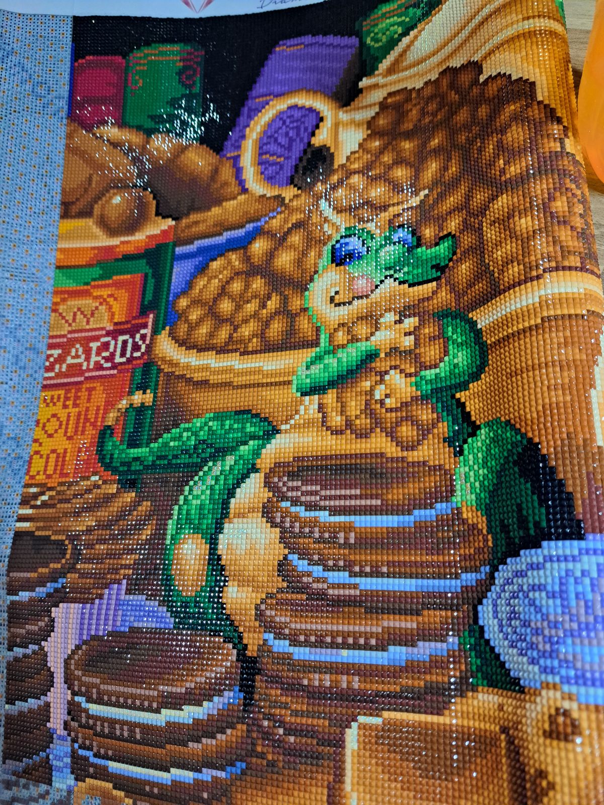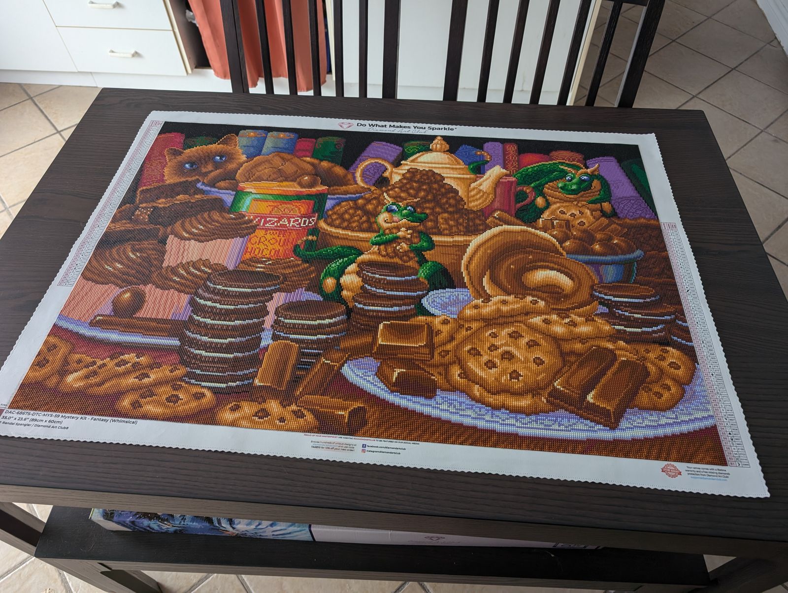 J'ai adoré faire cette toile ! C'était ma première toile mystère et j'adore le concept, j'étais impatiente de continuer à la faire pour découvrir les éléments de la toile et le rendu final. J'adore tellement l'illustration, elle réunit deux trucs que j'aime beaucoup : le sucre et les dragons !