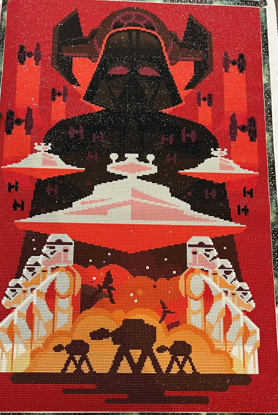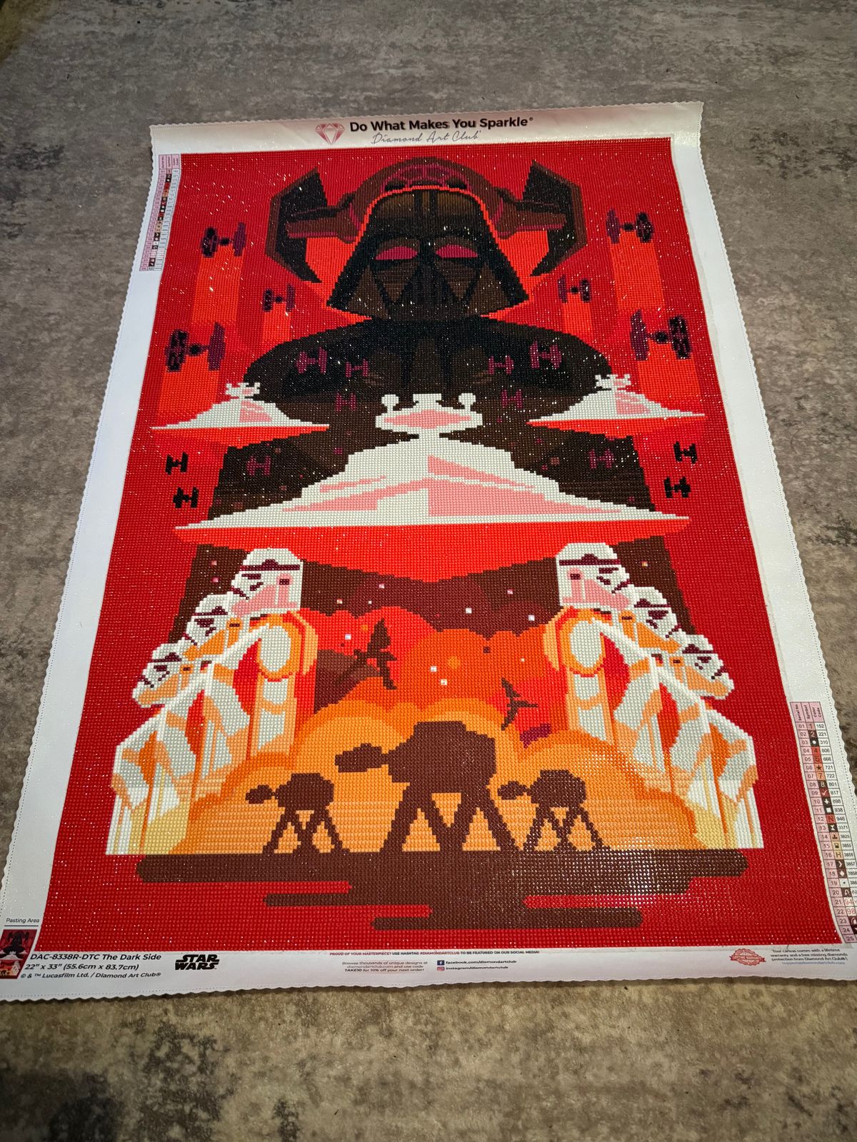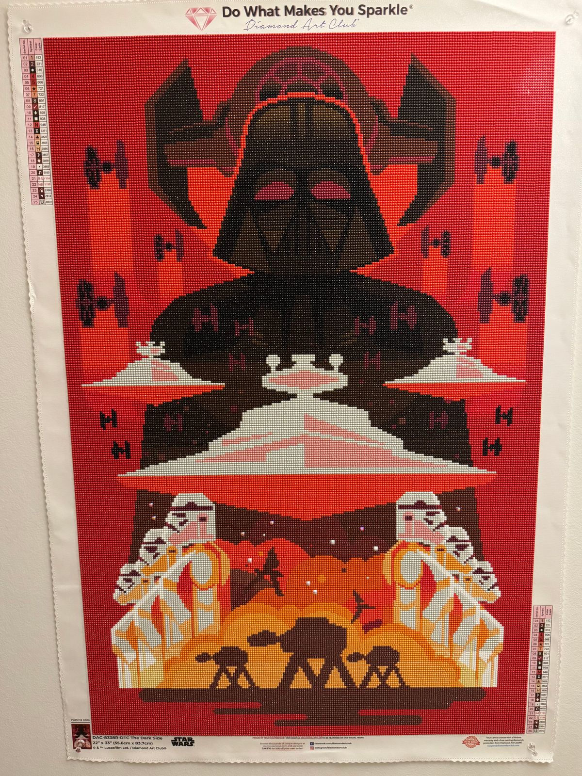 I absolutely love that DAC came out with Star Wars paintings. This is the 1st one I’ve done in the series. Canvas was amazing to work with. Hardly any trash drills. Only complaint I have was the special (quad) drills. DAC only provided enough to fill the spots they were to go. Which would normally be fine, except one of the special drills did not have the AB coating on top of the drill but it was on bottom instead. Definitely not worth requesting extra drills for. But maybe in the future provide a few extras, for this very reason. Not many, just maybe 2-3 extra. Other than that, I loved the picture and working on it. Did provide a picture of the drill missing the AB coating.