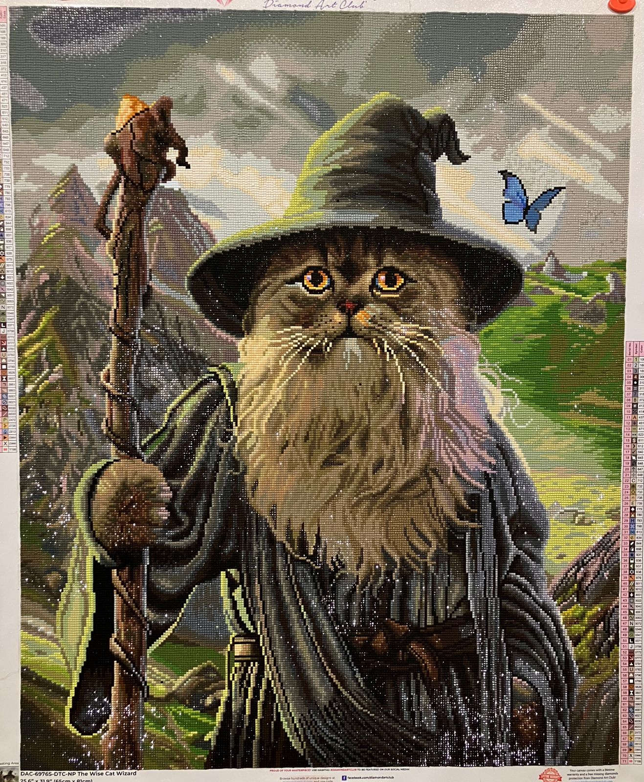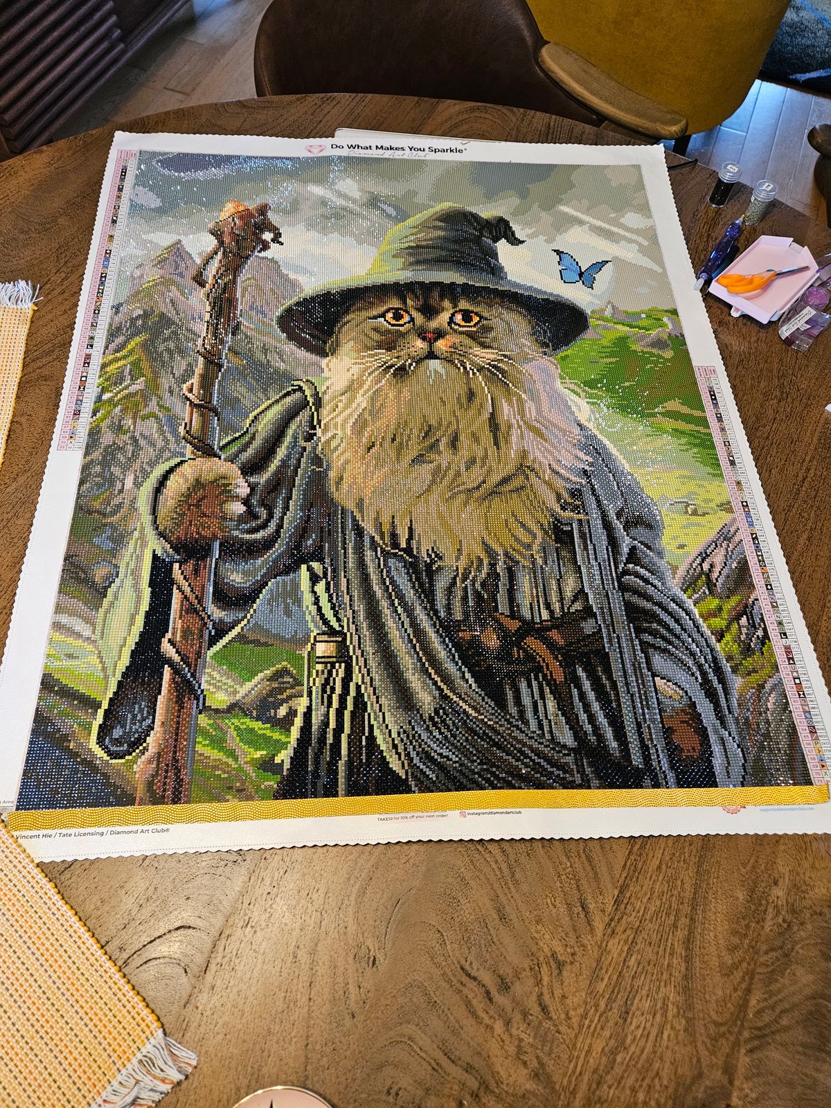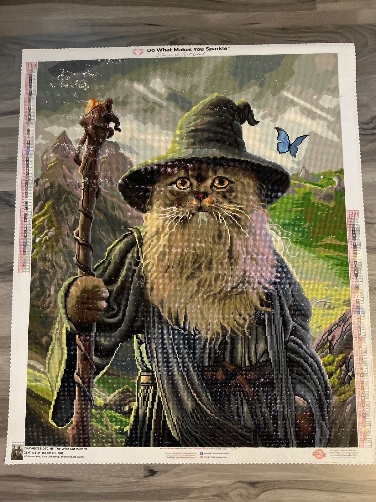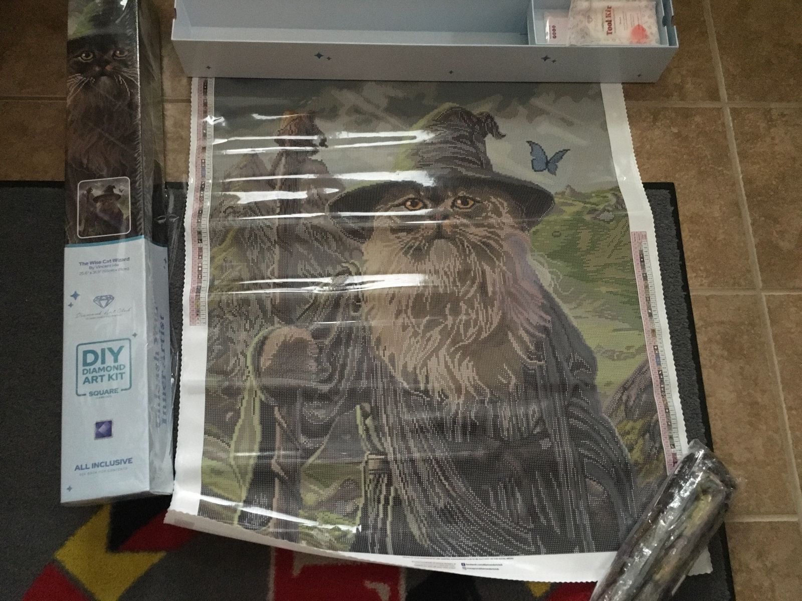 I am a huge fan of diamond paintings with cats doing things that their humans do, so this kit was perfect for me. As all Diamond Art Club kits that I have received so far the quality of the adhesive, diamonds and canvas backing are second to none and I even love the drill pen that comes with it. It has a built in wax that you can turn the tip to release more as you work. It's a good weight and size as well. My only complaint is that the rendering of colour on the right side of the cat's beard is not right. It comes off as a soft baby pink and clashes with the rest of the tones of the hair in the beard. I had my doubts as I was working on it and now I regret not listening to my instincts and taking out my extra diamonds to find a light colour that would be a good in between that of the whisker colour and the grey beard colours.