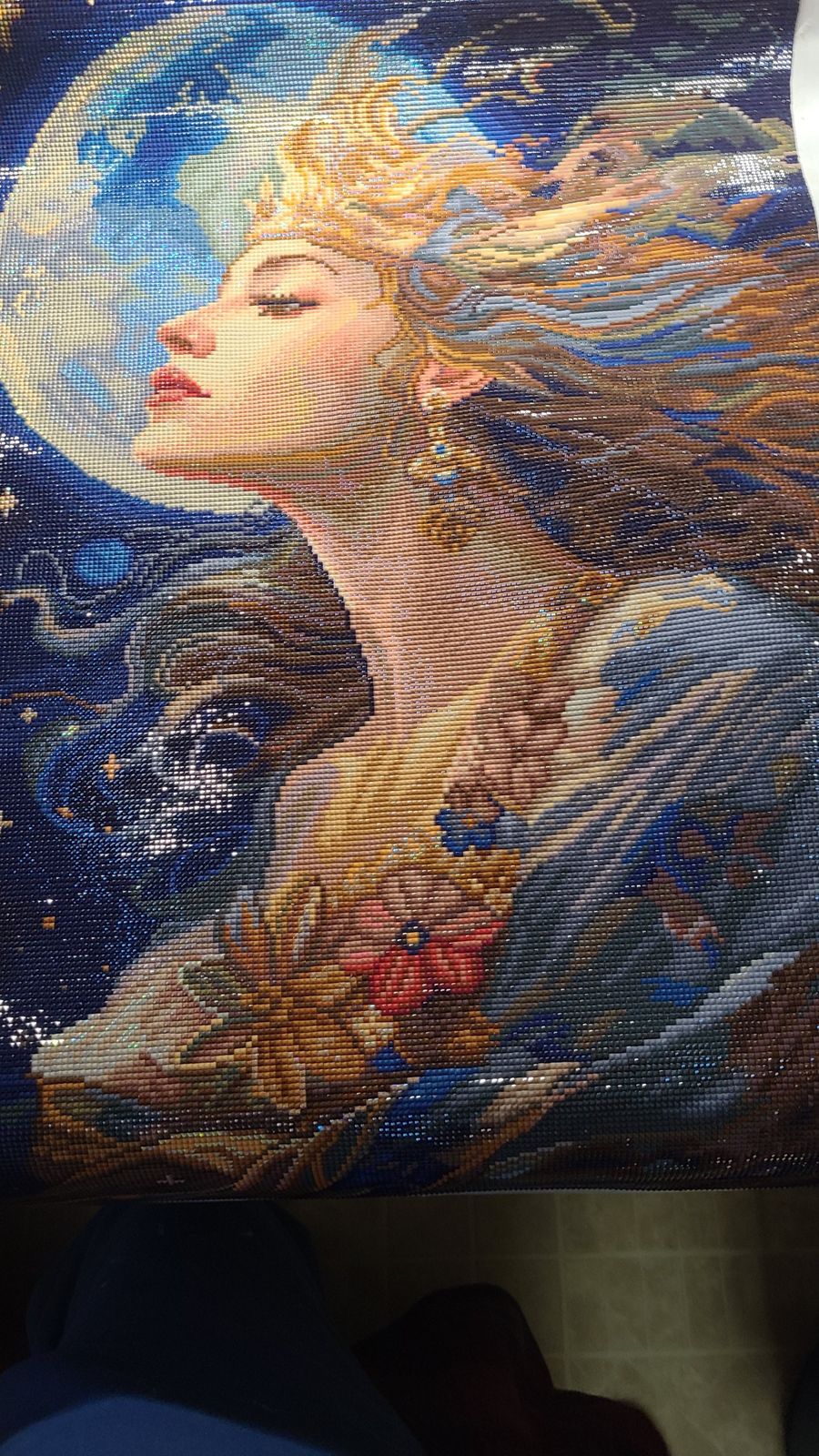 ​Dieses Diamond Painting ist einfach atemberaubend. Die Details der fließenden Haare, die vor dem leuchtenden Mond in den Nachthimmel übergehen, kommen durch die Mosaik-Struktur perfekt zur Geltung. Besonders beeindruckend ist der Kontrast zwischen den kühlen Blautönen des Weltraums und den warmen Goldtönen ihrer Krone und Juwelen. Ein echtes Highlight für jede Wand!