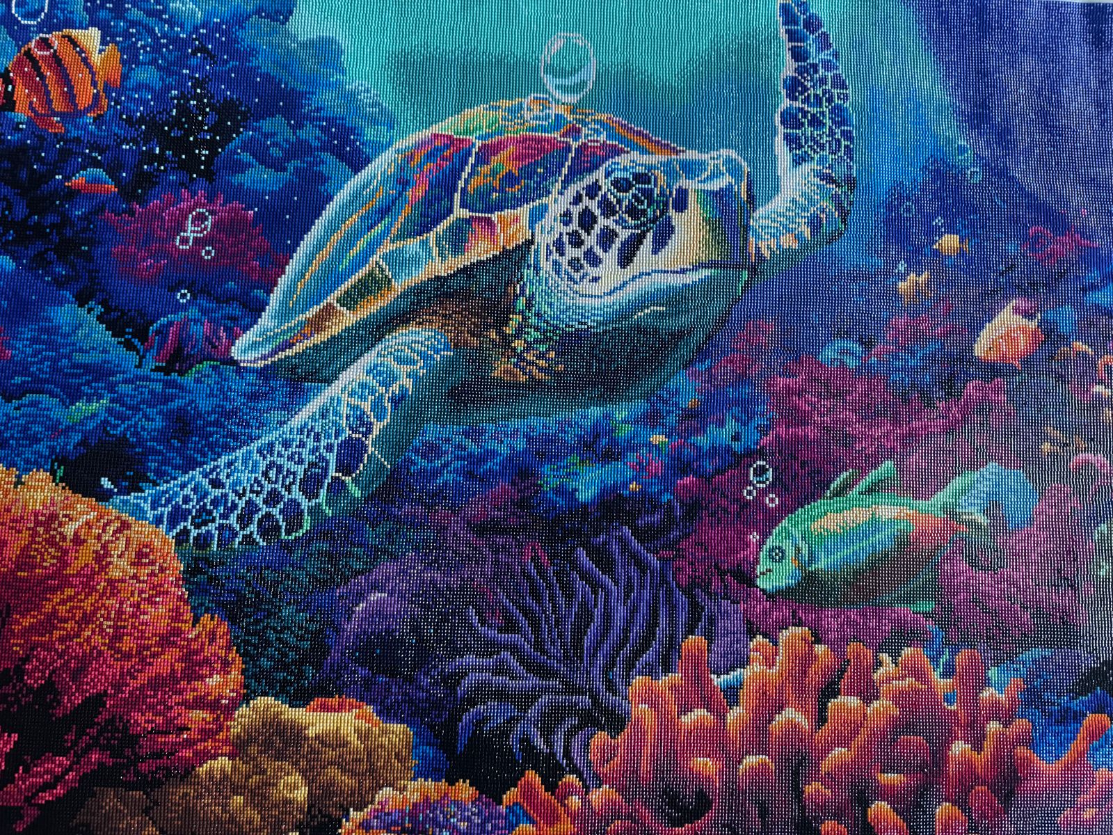 I thought this would be a lot of blue, but it turned out beautifully. The turtle in the middle is quite fun and the coral is just stunning!
