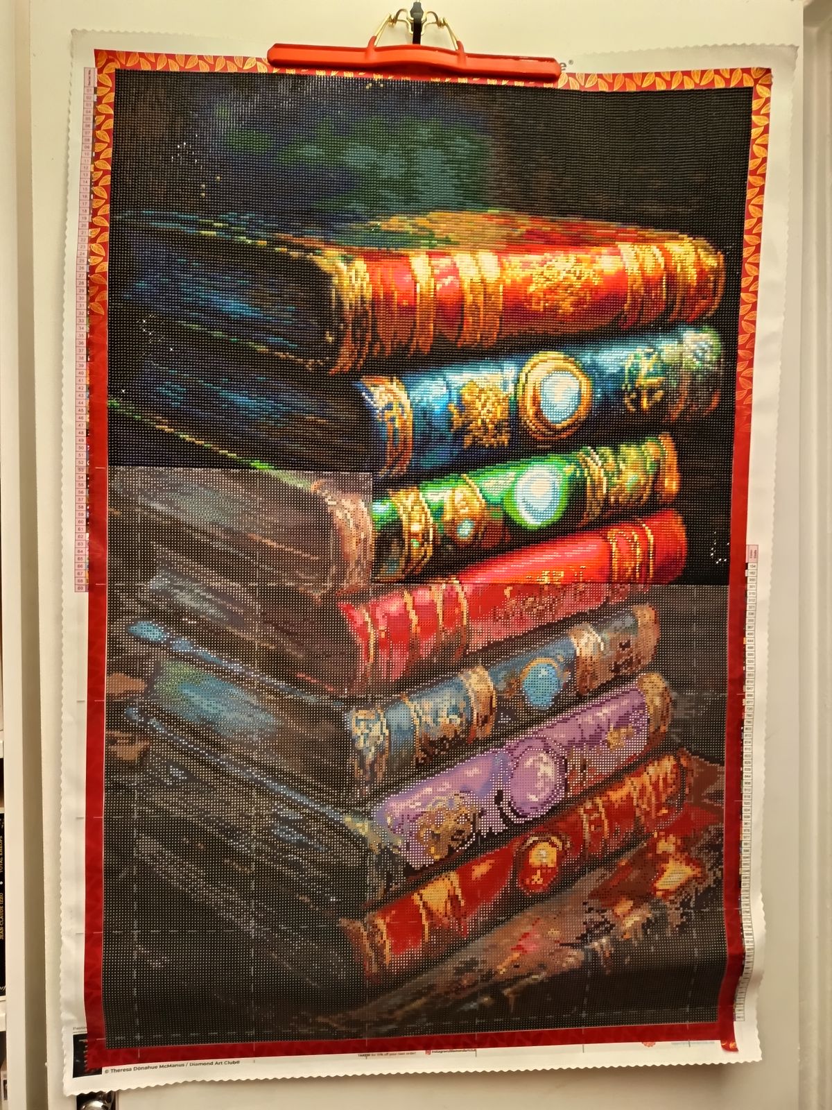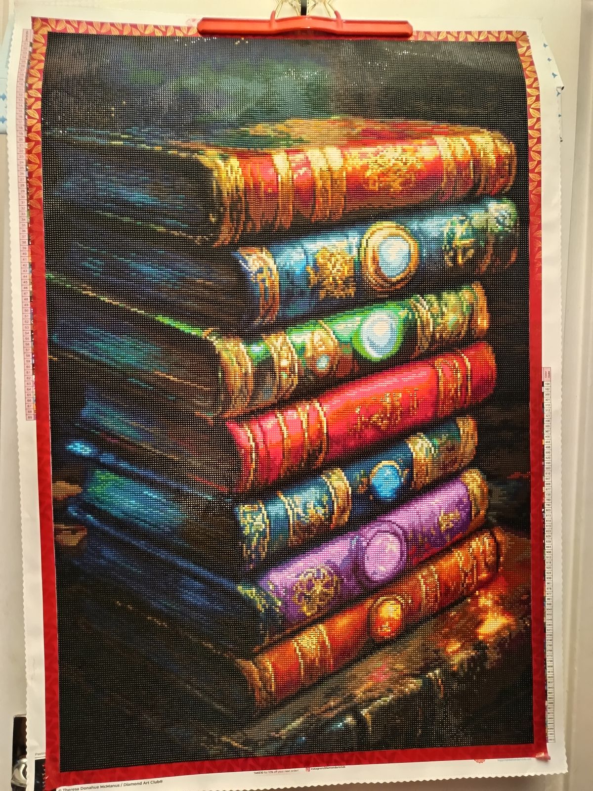 I wasnt sure about this painting until I got it in and kitted it up. It has A LOT of 310, 3371, 3799, and 939 to make up the background. What I find interesting are the books. They are all different colors, shapes, sizes and I think that is what i look forward to the most. Not my normal bright colored pieces but still one to look forward to, or buy if you haven't already!
