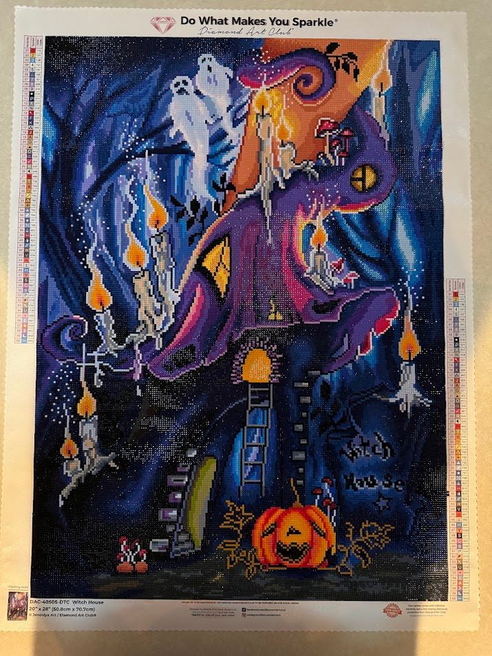 What a fun canvas. Still working. A lot of dark colors so you got to love dark but I love Halloween and anything witchy. It’s a different fun pic. Purple very pretty.