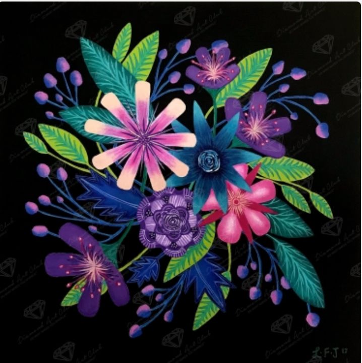 Experience this sparkling floral delight of rich plums, effervescent pinks, and emotive teals set against a jet-black background. "A flower does not think of competing with the flower next to it. It just blooms.” ~ Zen Shin.