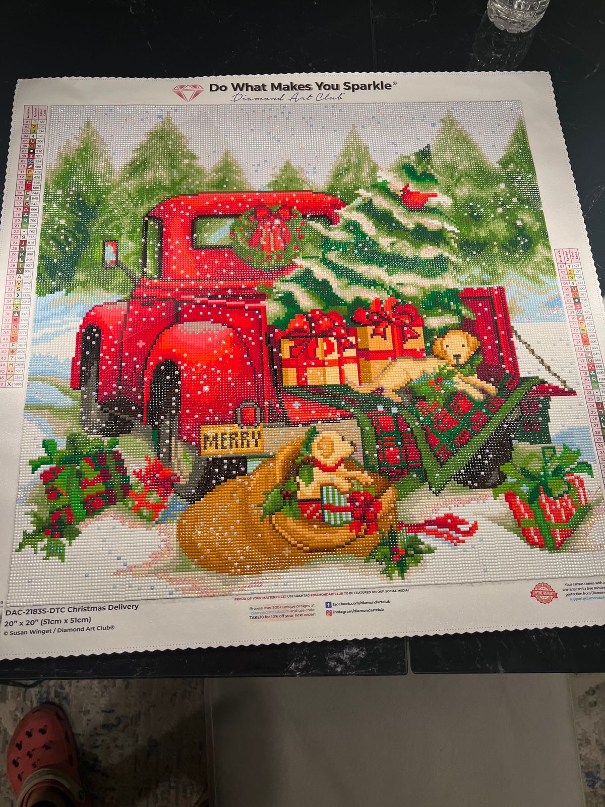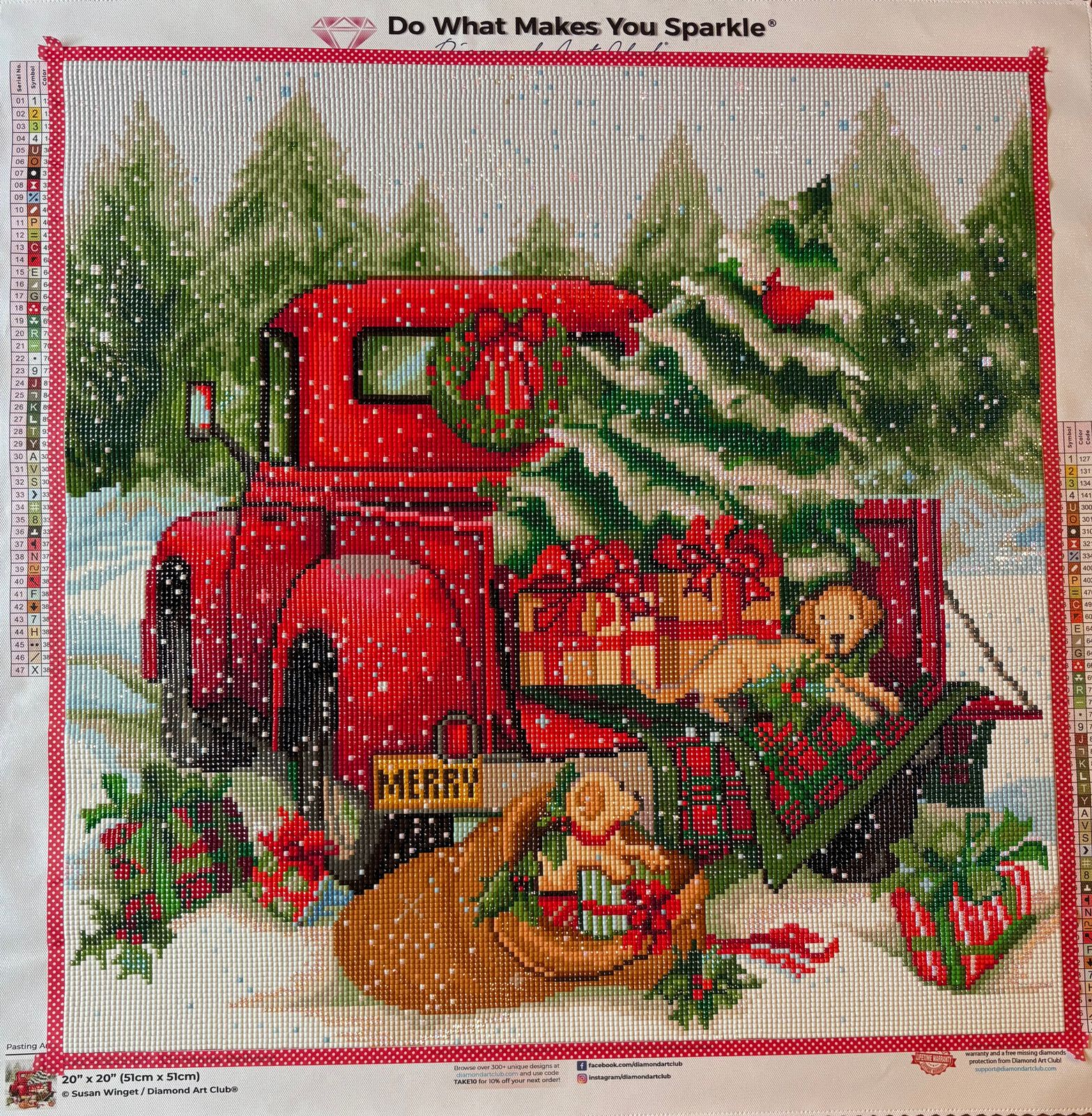 This is the smallest sized canvas I have done from Diamond Art Club so far and even with its sizing it packs a lot of detail. The snow sparkles are so charming and adds that extra bit of magic. Very relaxing colors with a pop of red, so peaceful to work on 😌