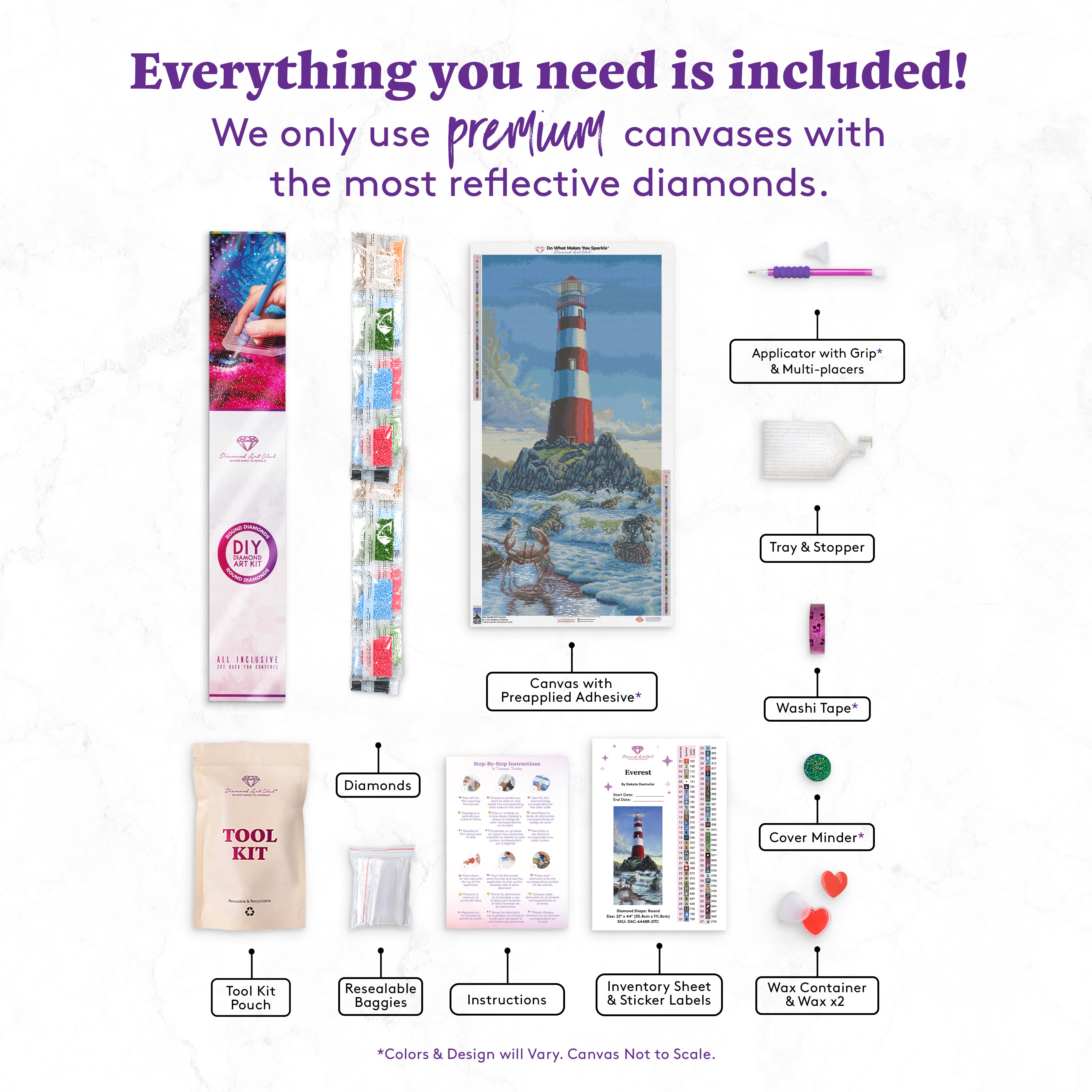 Canvas x 1, Diamonds, Tray x 1, Applicator + Grip x 1, Wax x 2
