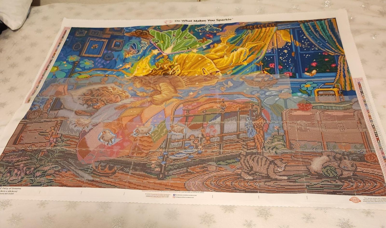 This is my favourite piece I’ve ever completed from this artist. The colours are gorgeous, gold, greens, blues… so bright and uplifting. It’s a larger painting (took me about two months) and the quality was great, clear symbols, no issues with drills, and a great balance of confetti and colour-blocking. The final result is stunning in person and sparkles beautifully. Def recommend if you want a magical project.