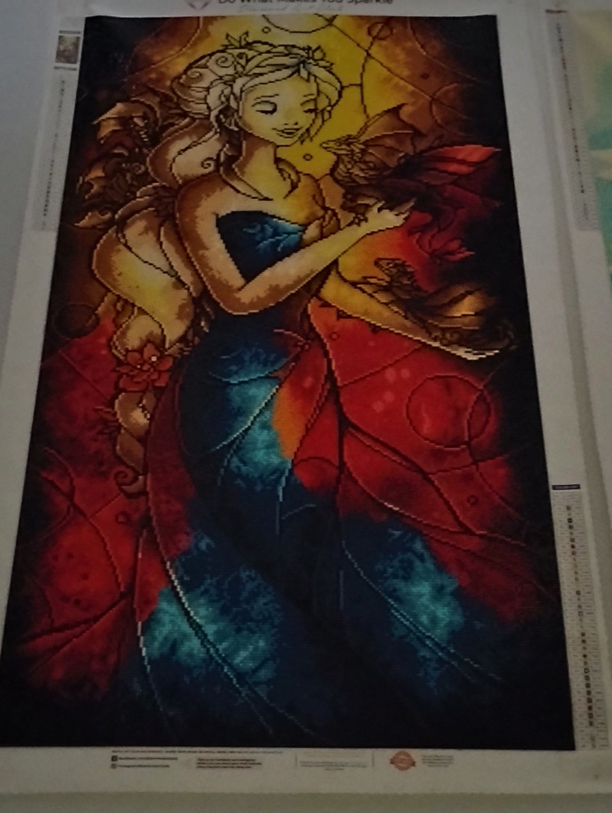 I enjoyed doing this project, the colors were very vibrant. I do have to admit the dragon her shoulder I made a mistake and had to go back and pull diamond to put the correct ones on it. You can not go wrong with this one!!