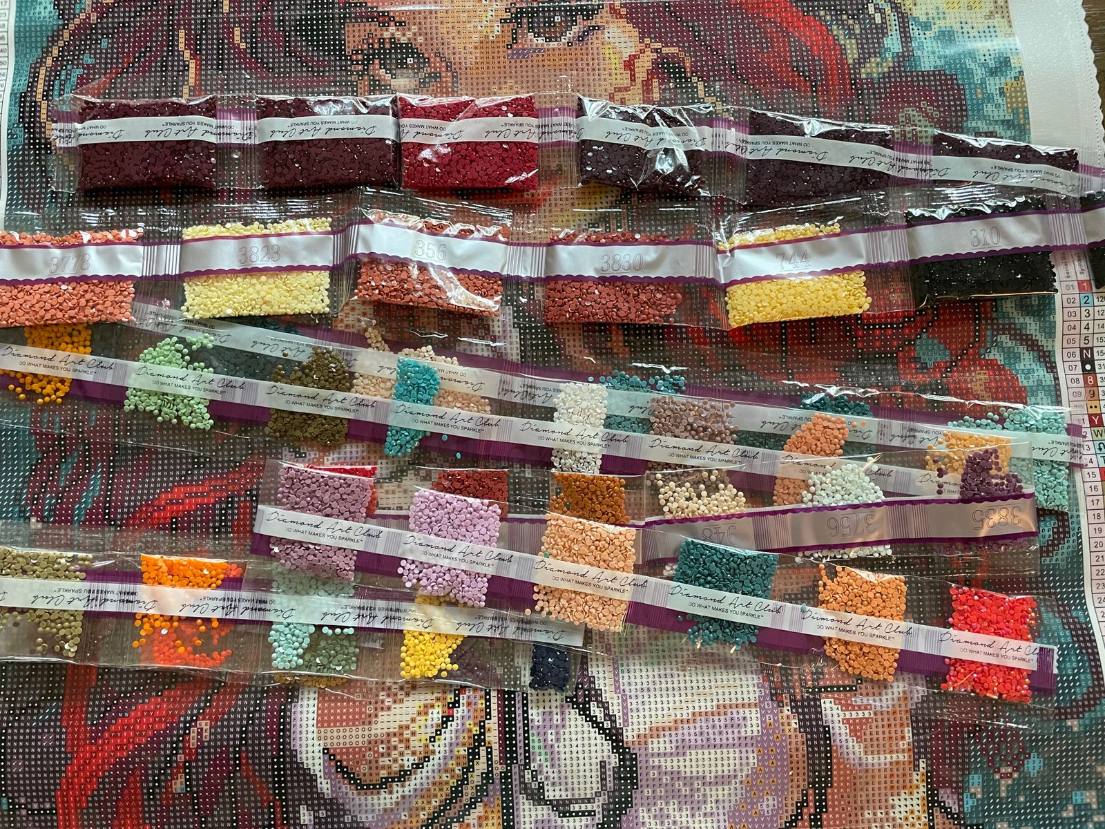 I love this diamond painting! The colours are so beautiful. There is a nice combination of colour-blocking and confetti, so it goes by quickly while still being interesting. I’m about halfway and all I can say is 🤌