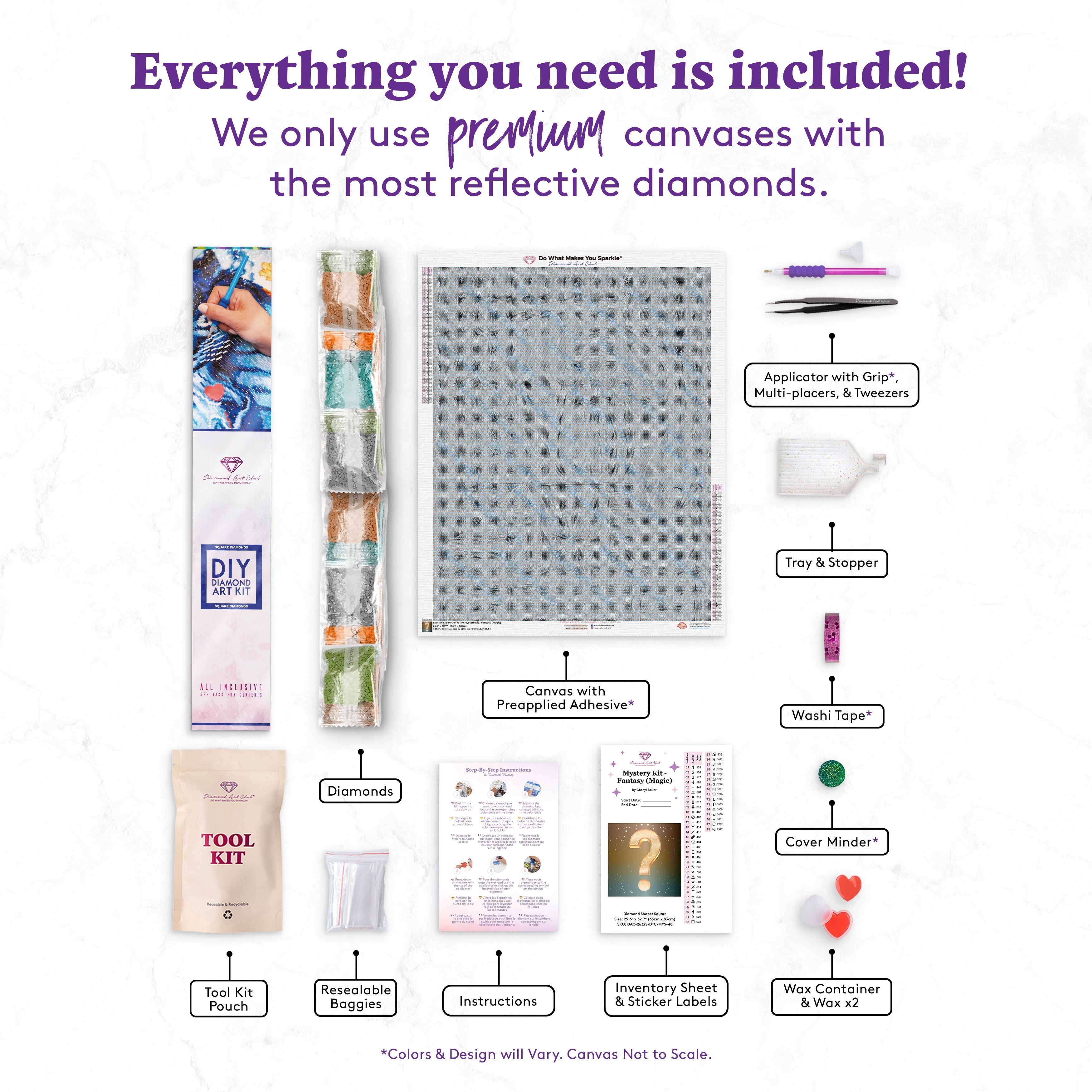 Canvas x 1, Diamonds, Tray x 1, Applicator + Grip x 1, Wax x 2, Tweezers x 1