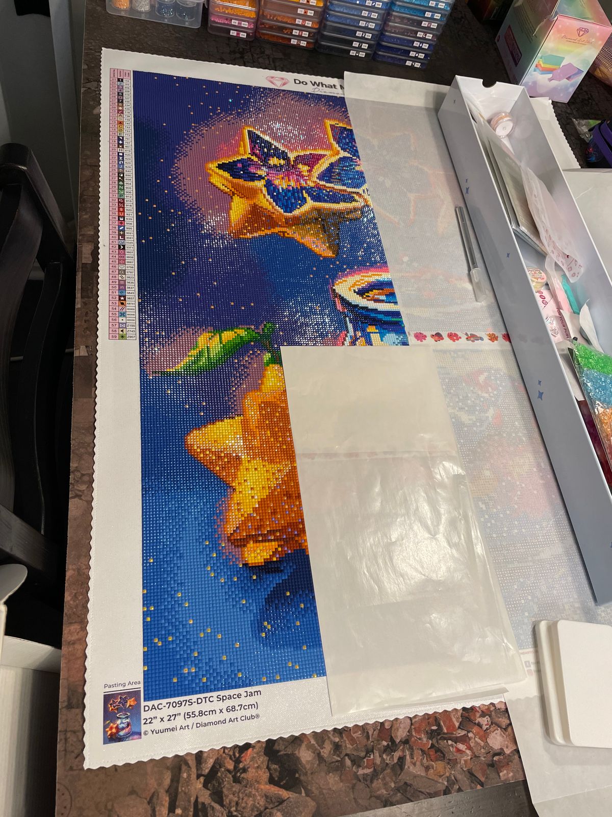 This is my first DAC project and I’m impressed with the quality of the render, canvas and square drills! It’s a beautiful design with a great mix of color blocking and colorful confetti. My favourite part is the yellow AB drills that pepper the background as stars. I’m almost halfway through and I look forward to working on this daily.