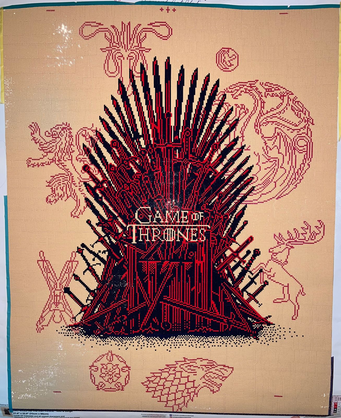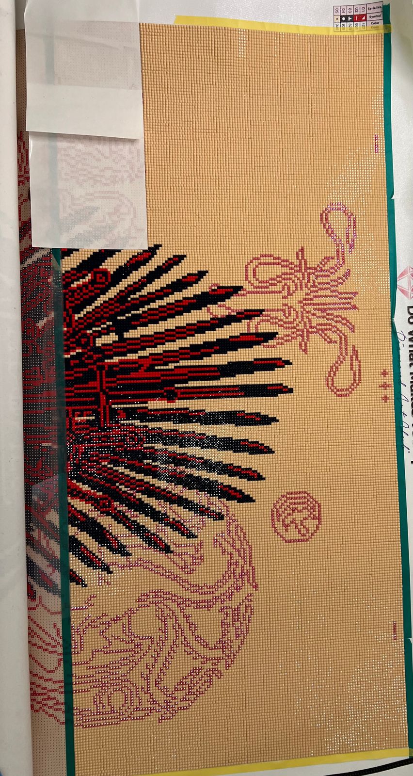 The lack of colors was daunting but with some minor enhancements made (gold lettering), i am in love! It look me around 4 months to complete. So much color blocking but it is great practice.