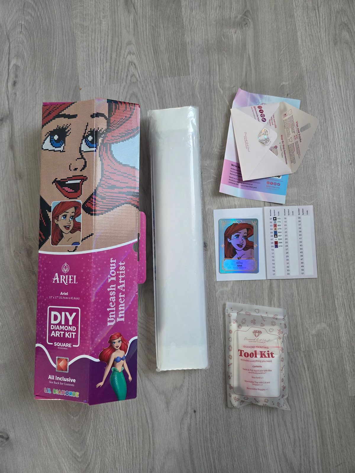 This kit is perfect to do in between big canvases. It’s mainly color blocking though but it’s a small so it shouldn’t feel too mundane. Her hair and top is all fairy dust. I’m happy that it still includes everything a bigger kit would come with, including the treasure quest card.