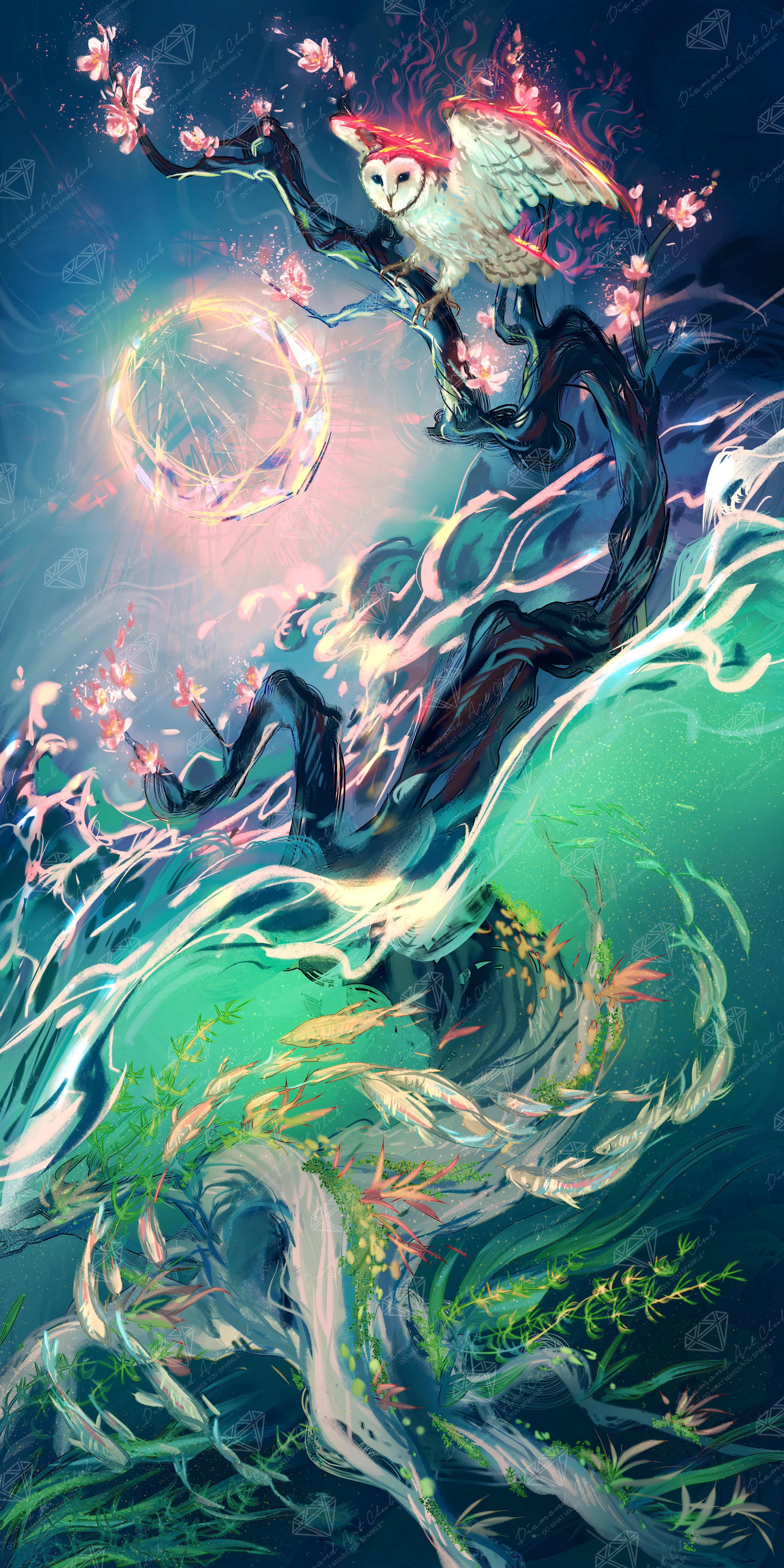 Ascend with the ethereal owl through swirls of magic and blossom in the glow of a mystical orb. Ride the currents of ancient powers as cherry tree branches reach out to the night.