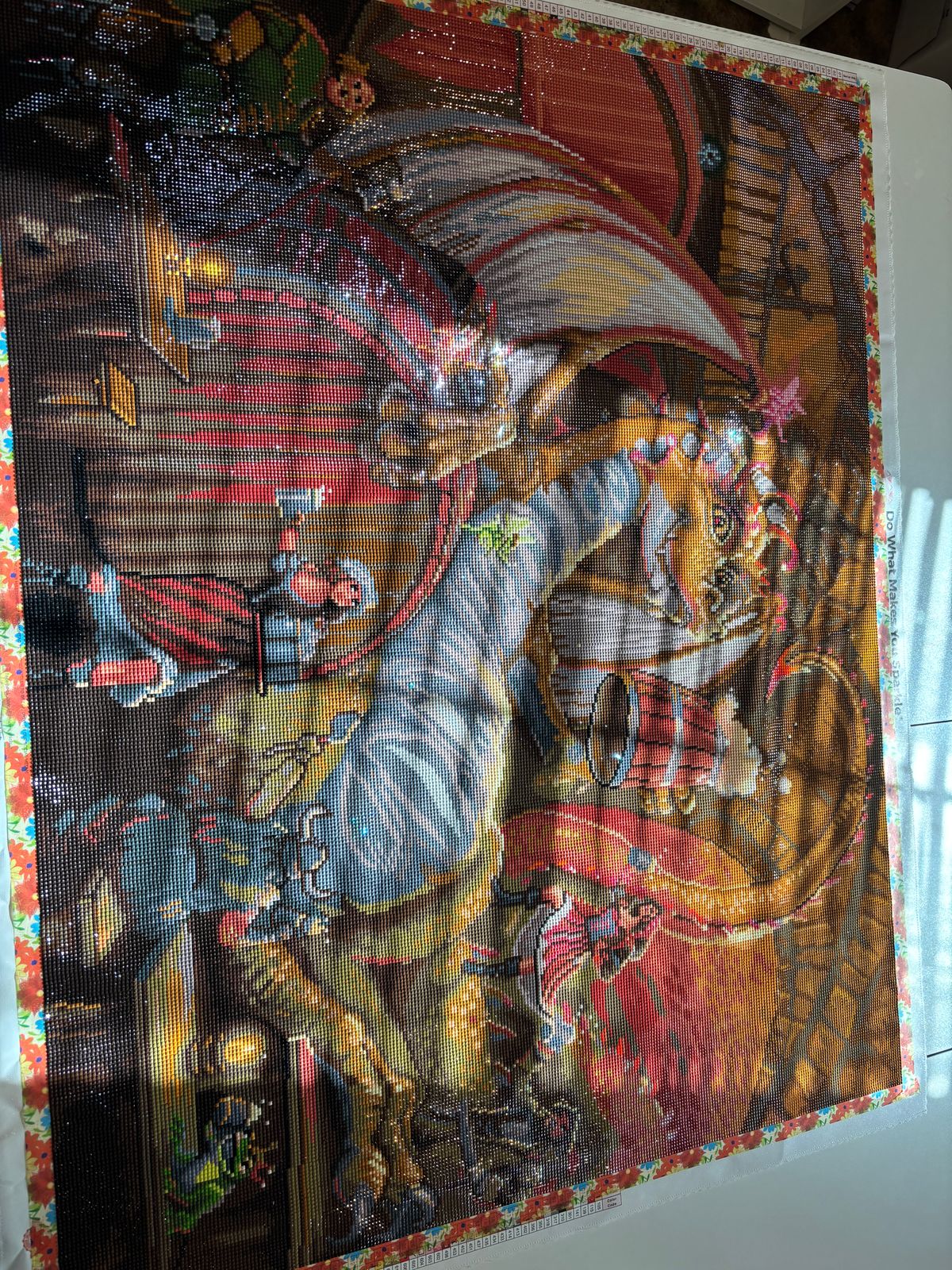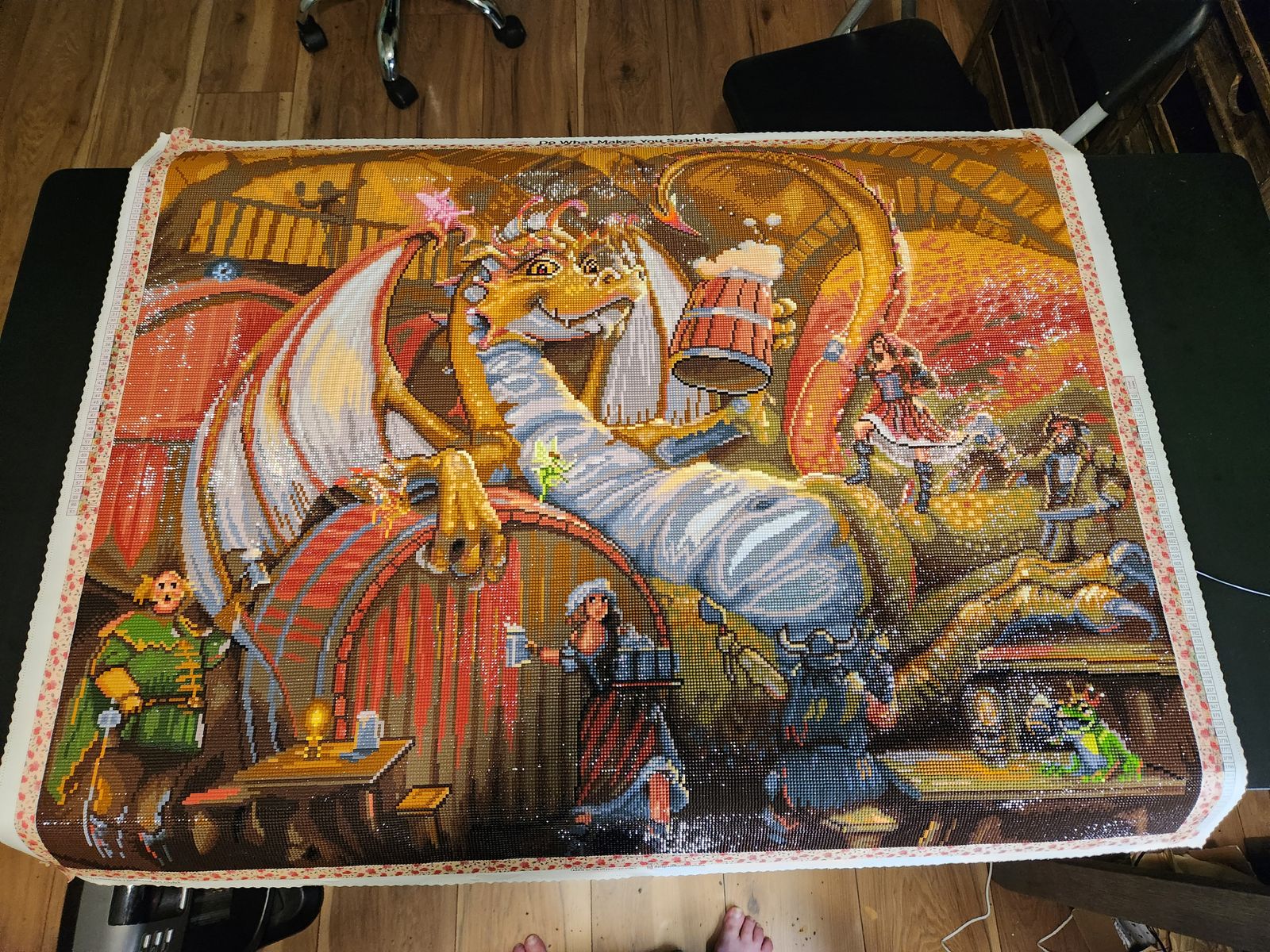 Adorable dragon, fun details in the picture. This was my first square attempt and it was a lot of fun to watch the colors really pop as I progressed. Looks great hanging up on the wall too!