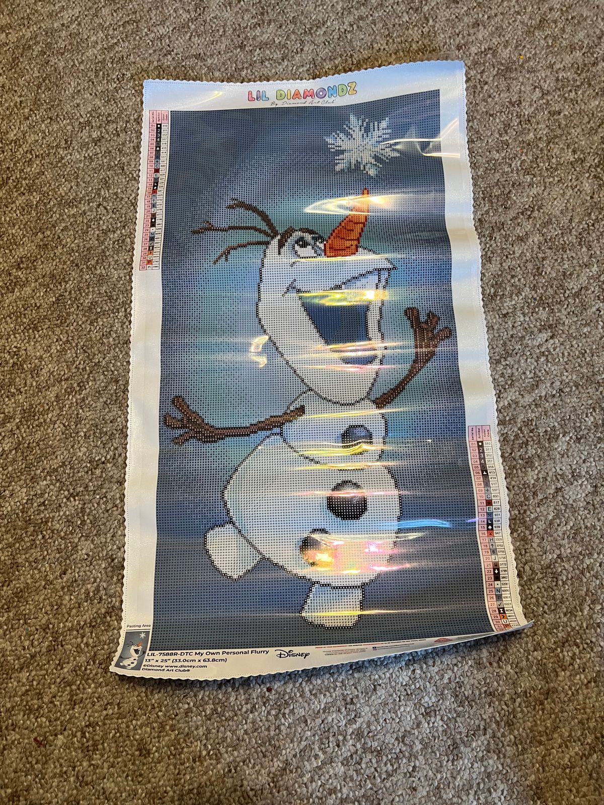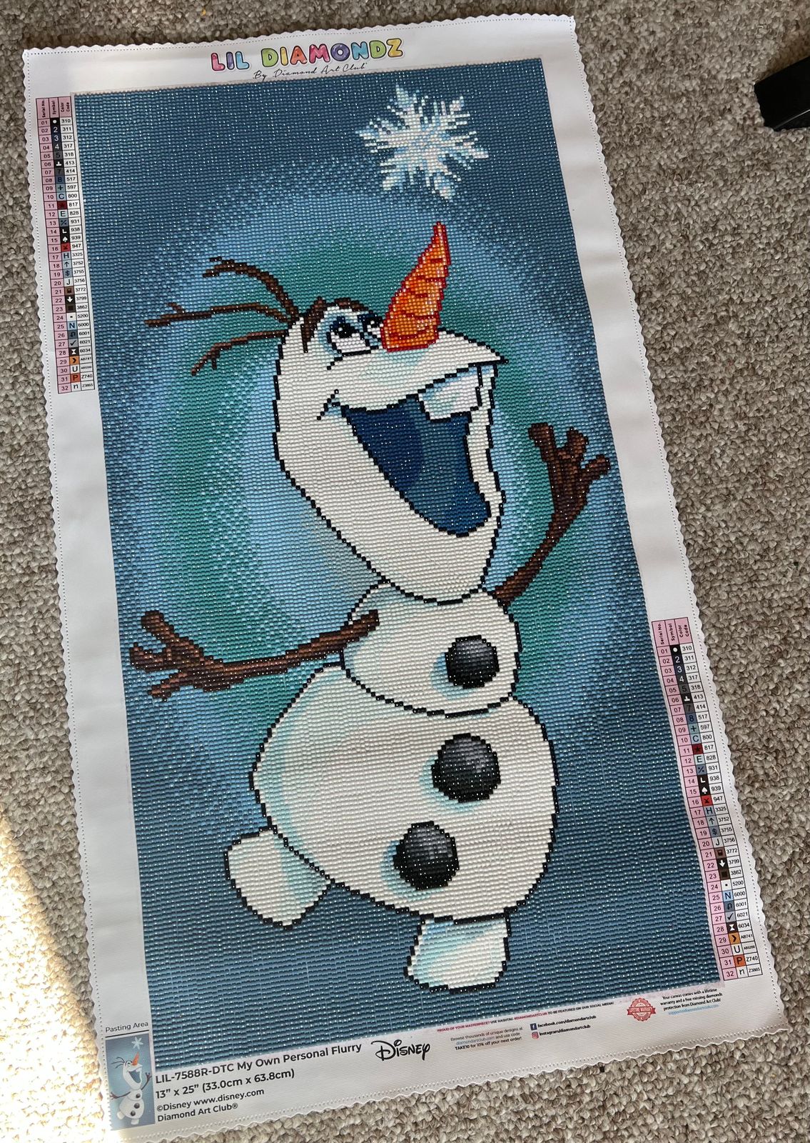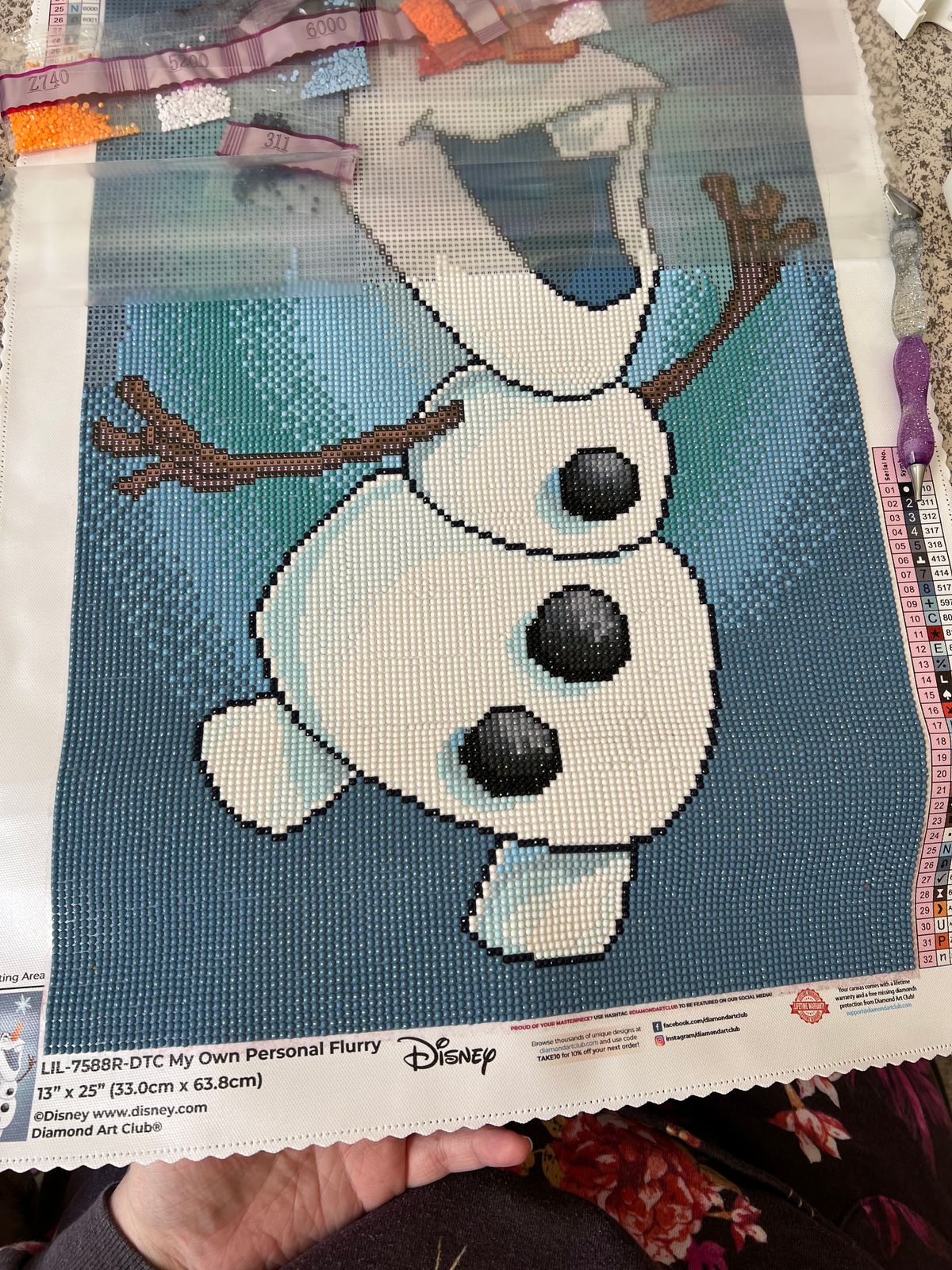 So I had made “Aurora” for my 4 year old granddaughter and when I saw this diamond painting of Olaf I just had to have it. This one is for ME! I collect snowmen and I love Olaf so I will love to hang it when it is done. The picture truely captures Olaf’s spirit. It’s a winner!
