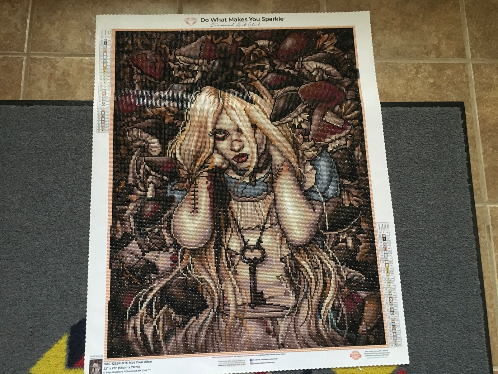 I like the dark side of things and this one was great in fulfilling that need. I was a little disappointed that the picture shows more redness on the arms than the actual diamond painting and the blood on Alice's apron was not as noticeable in the actual finished picture. But having said that, it still is an impressive diamond painting. It did not take long at all, less than a month, working on it for a couple hours a day. The round diamonds make fast work of the painting.