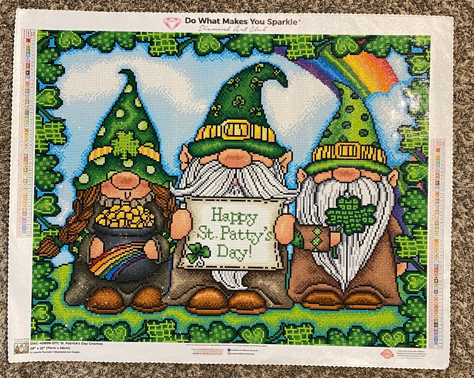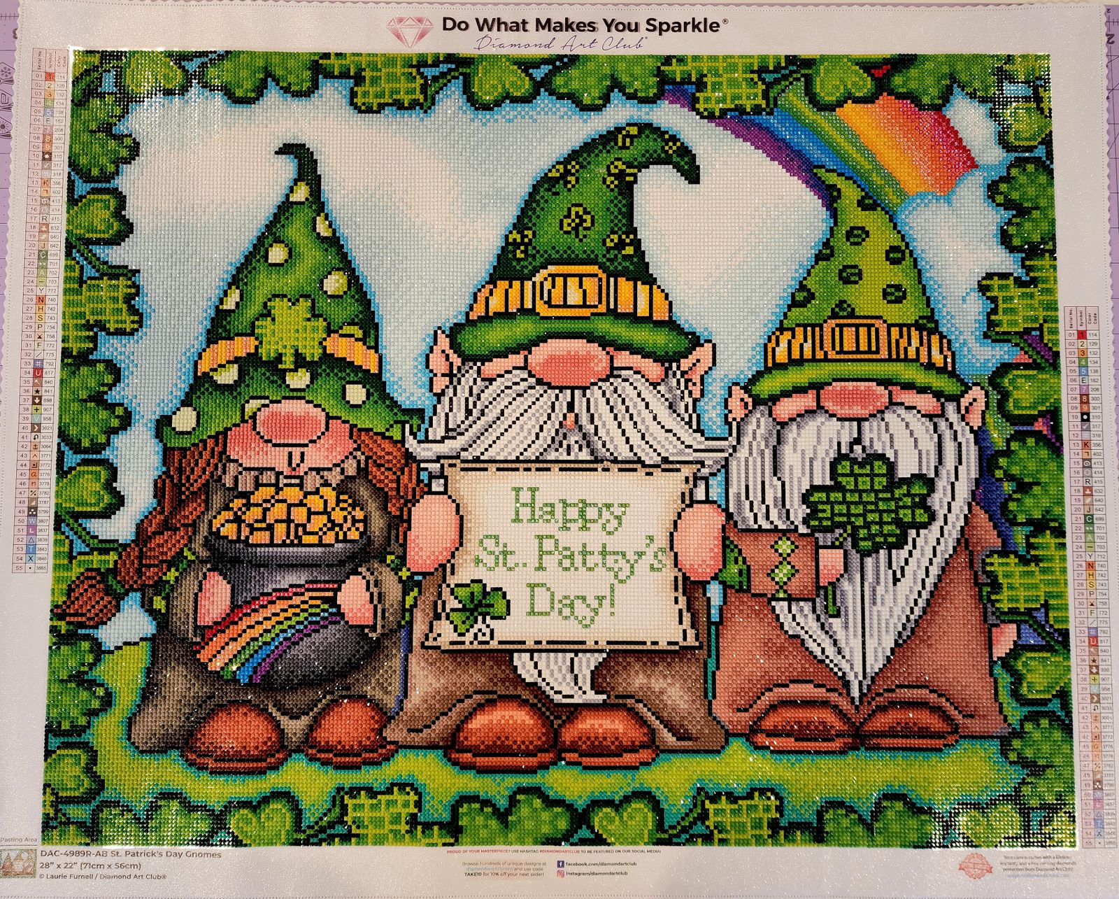 I love doing the Gnome paintings; and to be able to change the drill colours to make the painting a little more mine. I changed the 3865 white drills on the middle gnome to 5200 snow white, which makes his beard brighter. I also changed the AB drills for the words to green crystals.