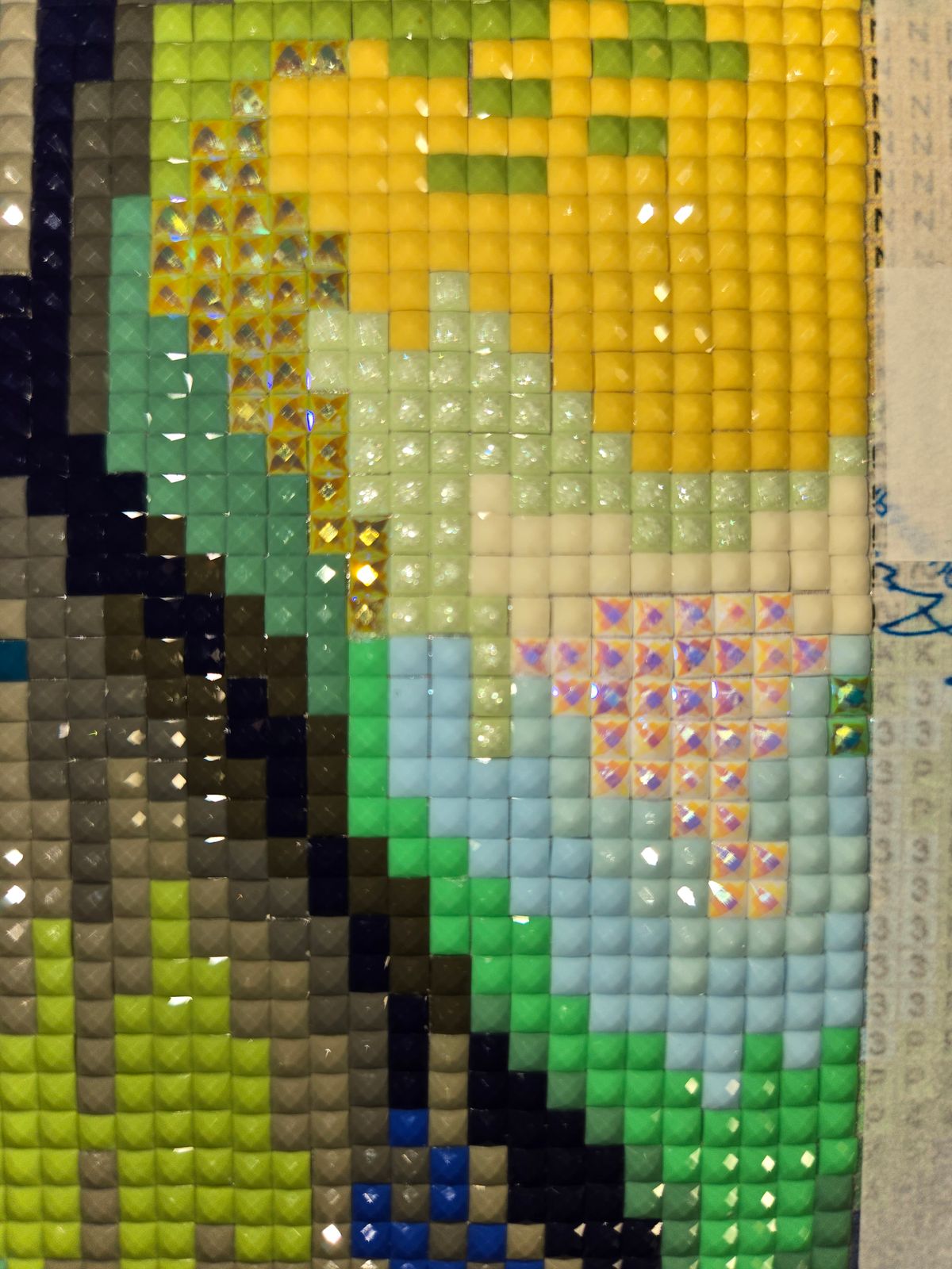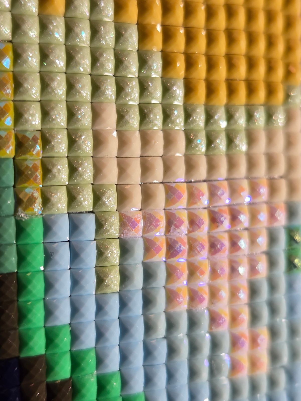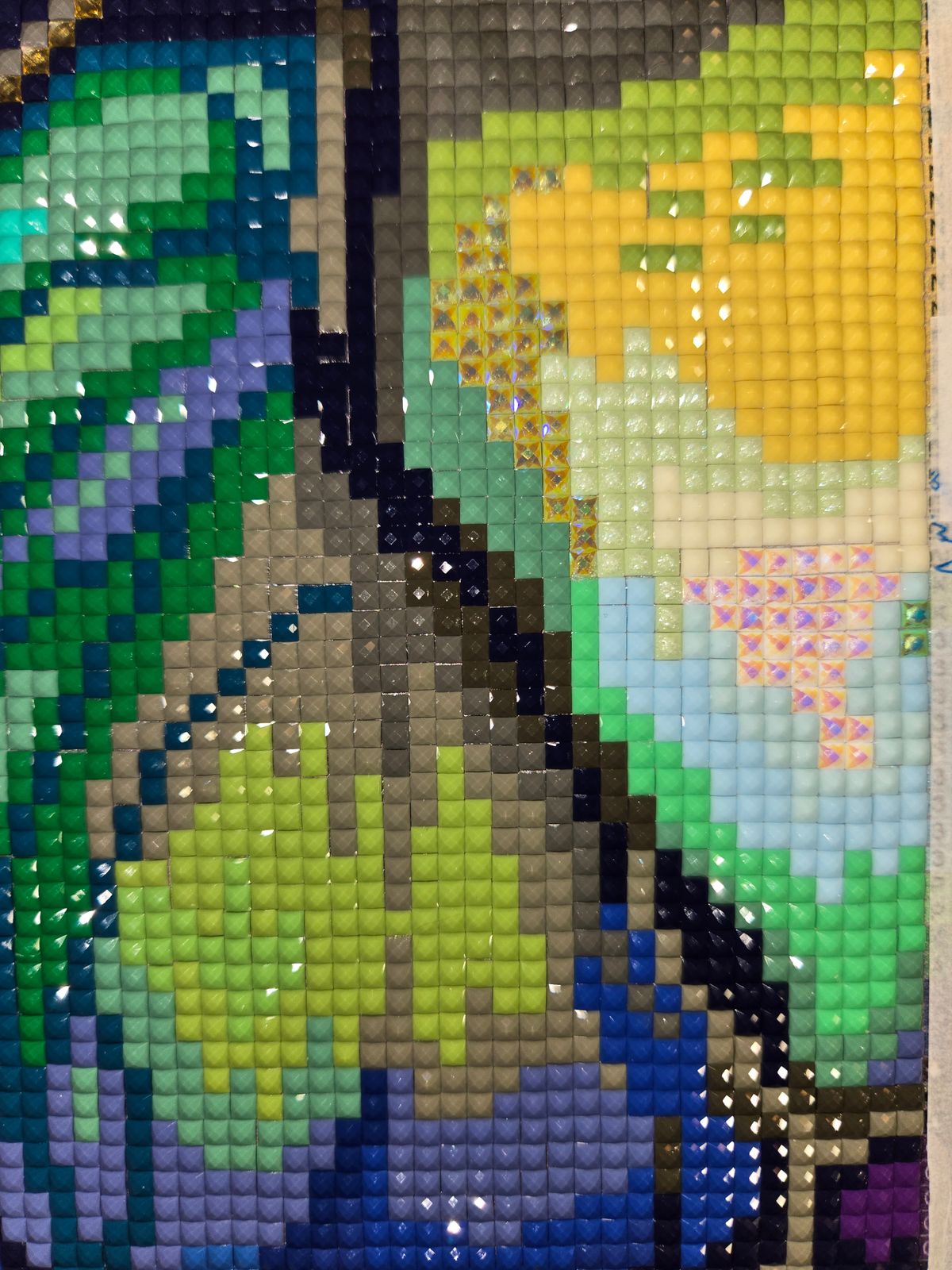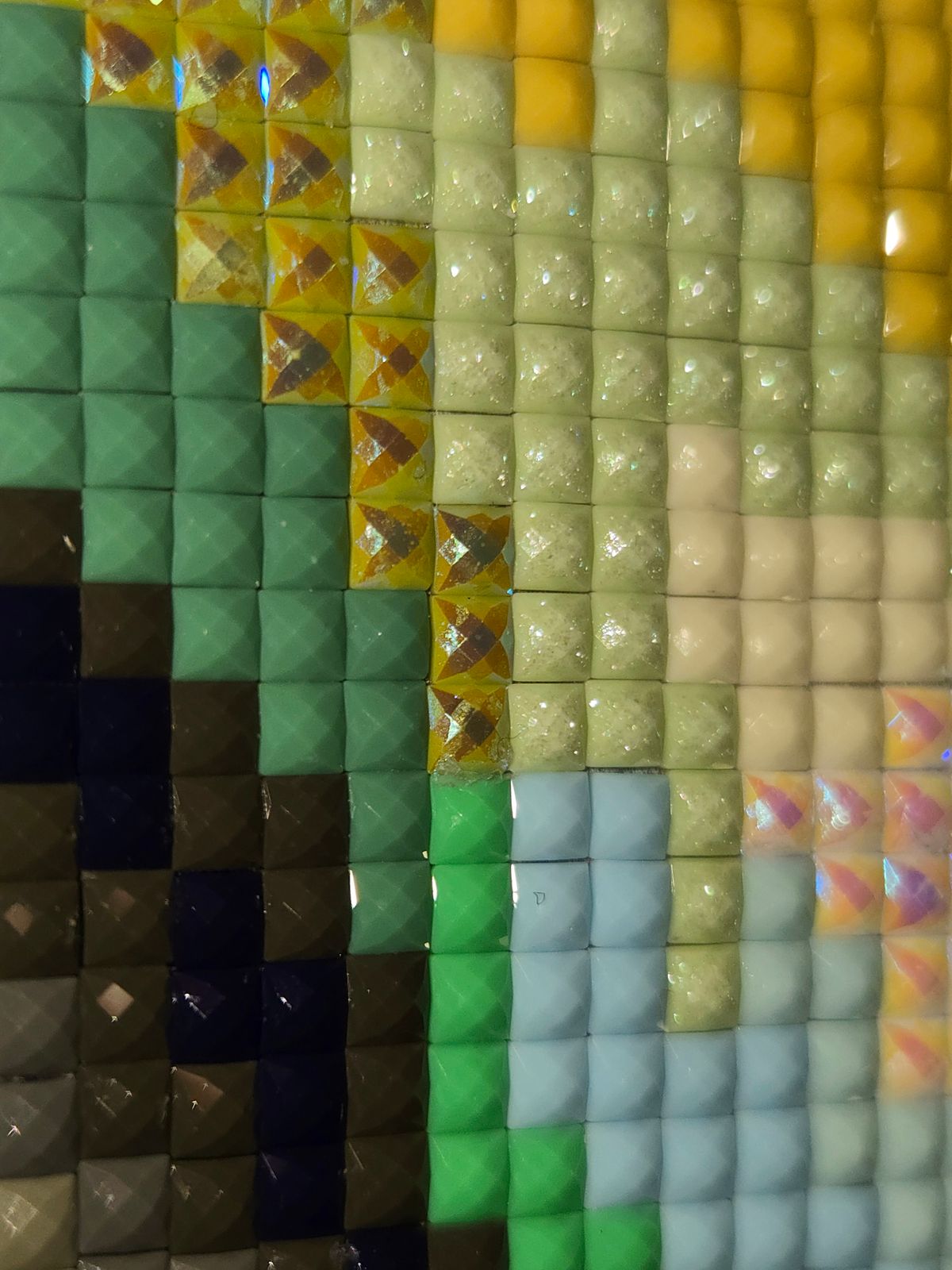 It is beautiful. There are glittery drills, gold, glass-like drills, and shimmery drills. It has a very irridescent look to it. It shimmers from every angle which is very difficult to capture in a photo. This is my first square drill and at my speed, it will take months to complete. Enjoy the journey!