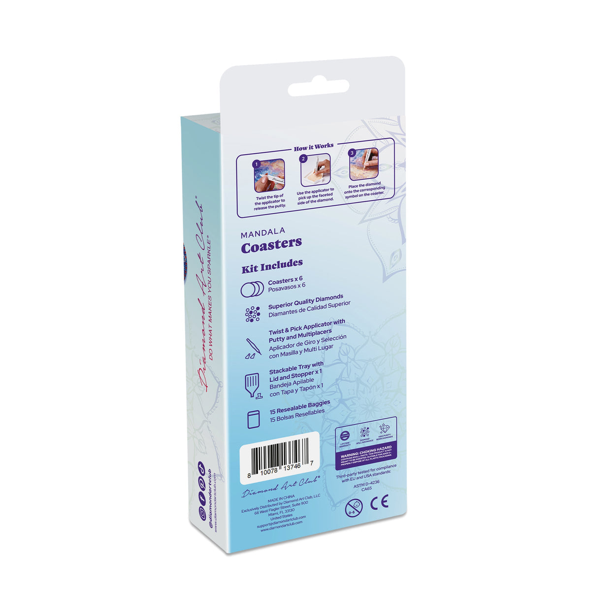 I received these mandalas from diamond art club!!! I love the diamonds they really sparkle like a real diamond, very sturdy coaster made out of wood also come with a flat cork board sticky back that you put on yourself. Every kit comes with everything you need. I just keep ordering more and more from diamond art club.