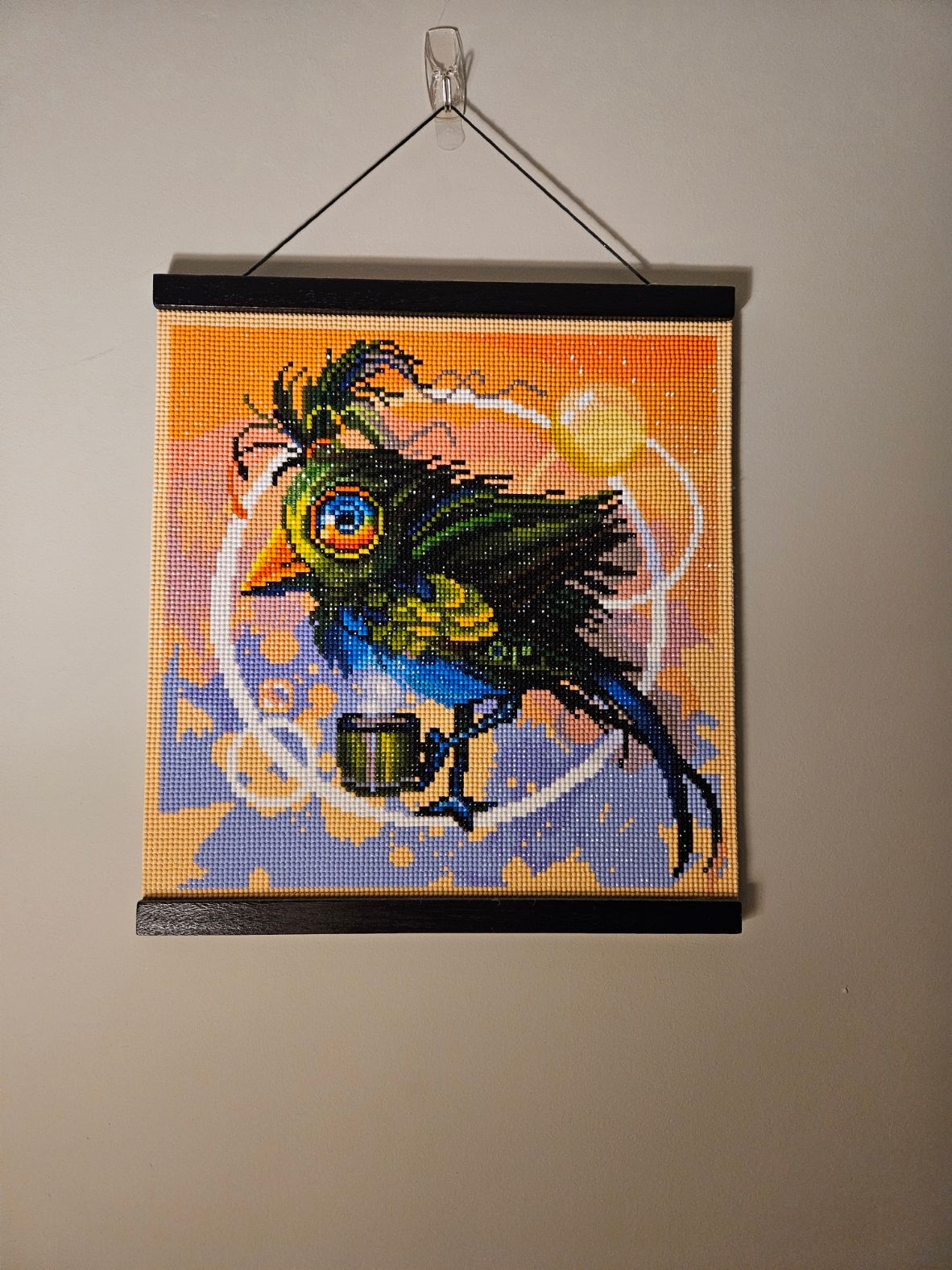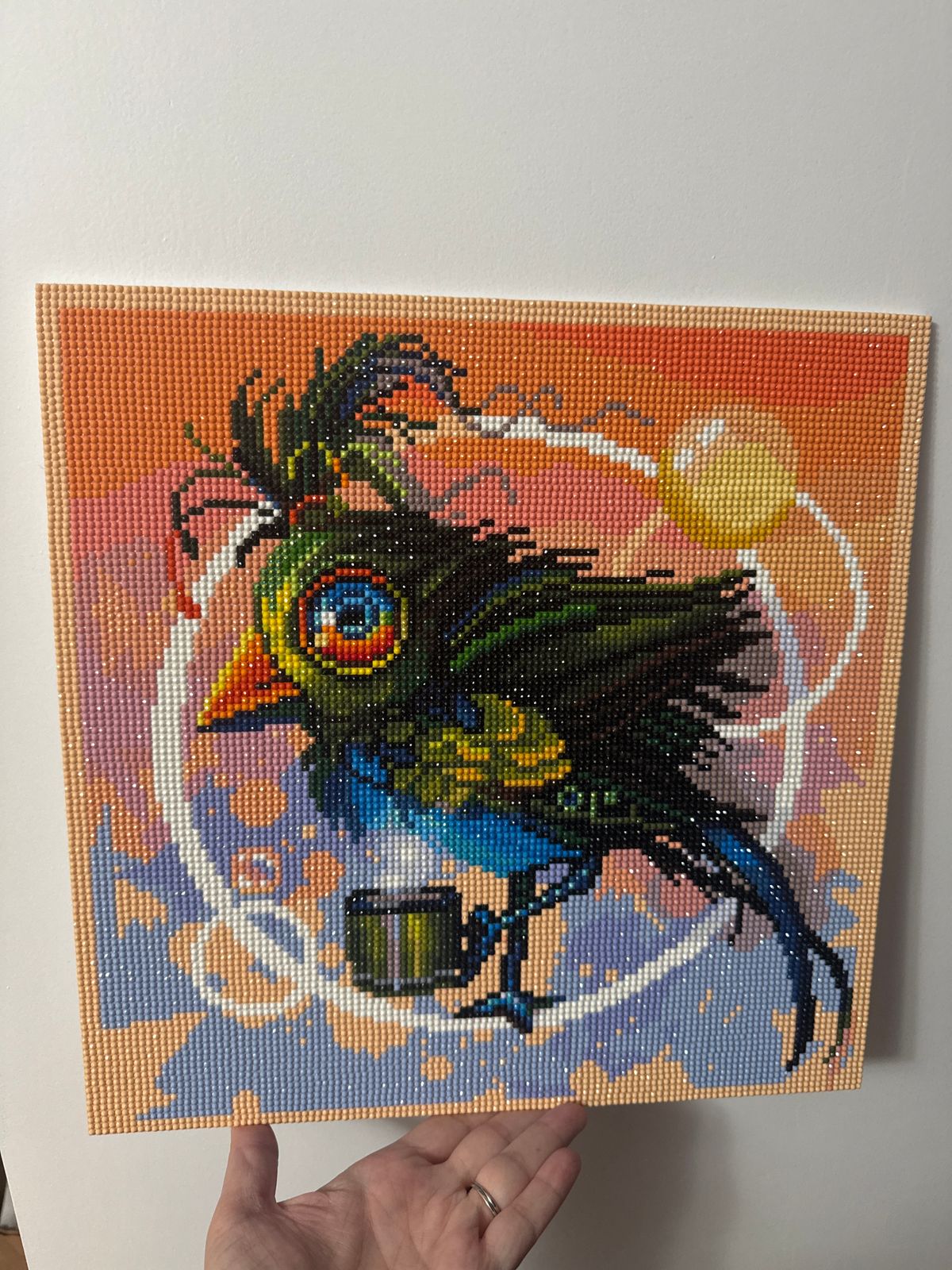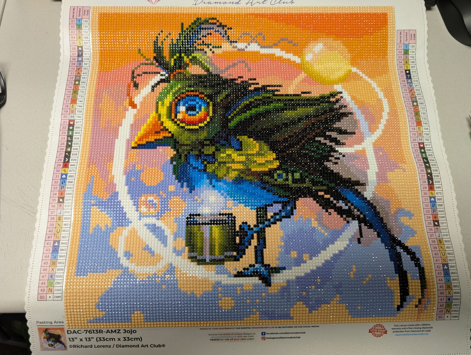 This was my first full diamond painting after trying out one of the mini dazzles kits. After getting some more diamond painting experience, I can say that Jojo was a great introduction! I love the colors, and the smaller size and my love for this goofy little bird made the process fly by.