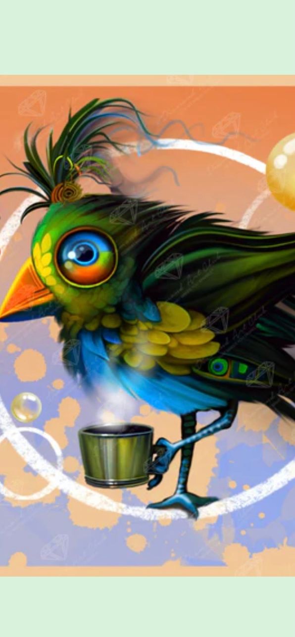Sip in the magic of morning brew; Jojo, the whimsical bird, knows just what to do! Let colors soar and spirits rise, under the gaze of his vibrant, wise eyes.