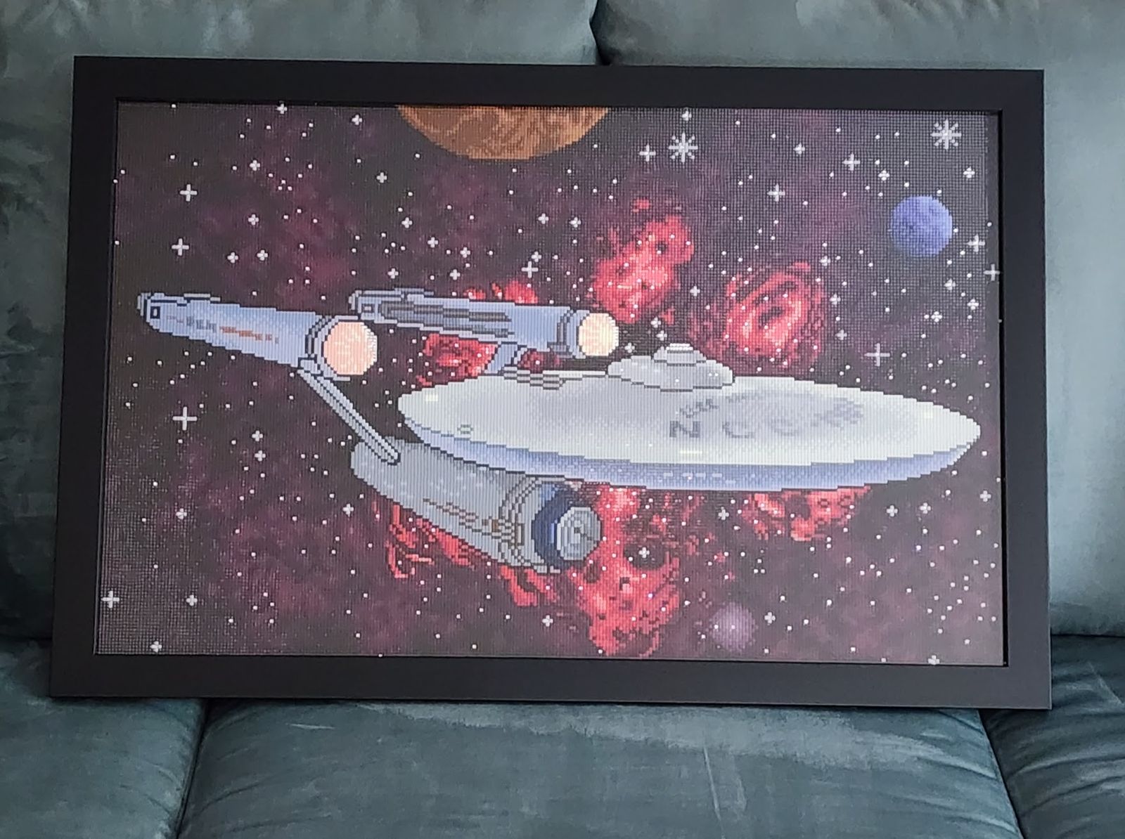 Beautifully rendered with a backgound of red and dark gray drills. If you display it with a light board it will have an almost 3D effect. The perfect gift for Star Trek fans.